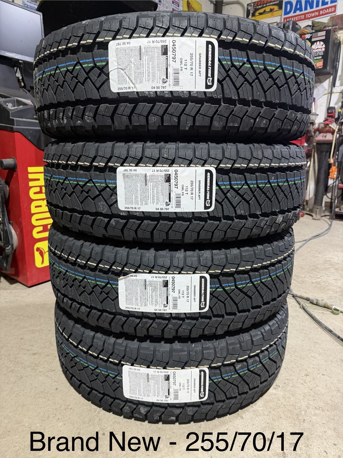 (4) - 255/70/17 General Grabber APT Tires Cards accepted with 2.8% merchant fee Condition - Brand new, never mounted. Standard load 4 ply tires 60,000 mile rated tires Installation is $25 per tire. $5.00 per tire to recycle the old tires Lifetime flat repairs included WITH the purchase of mounting and balancing. Does not apply for cash and carry sales Price is FIRM, NOT accepting offers. Not interested in trades. Other sizes and brands available, let me know if you’d like a quote. Thanks for looking!