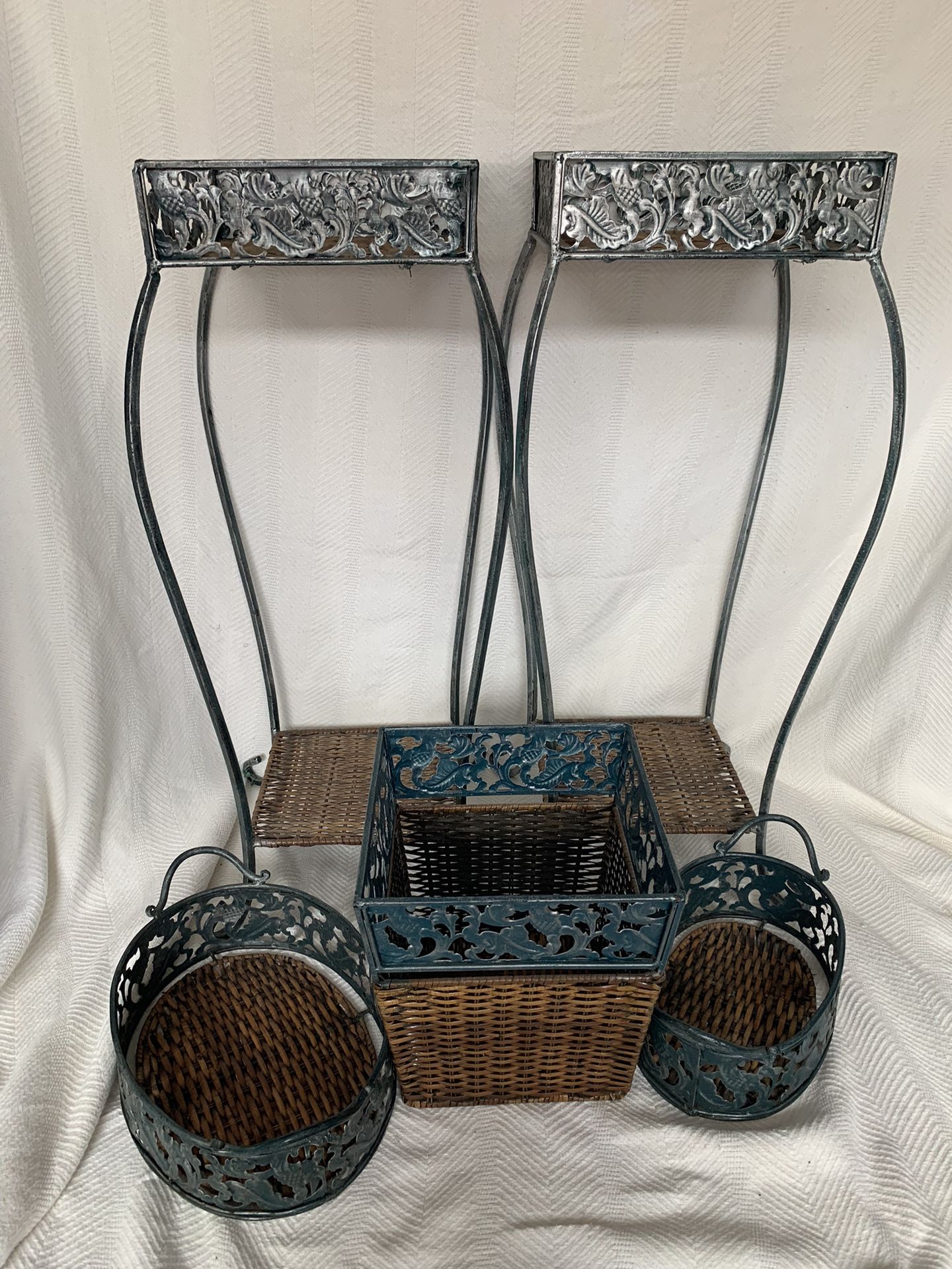 2 wicker stands with metal framing 2 oval wicker baskets 1 square wicker basket
