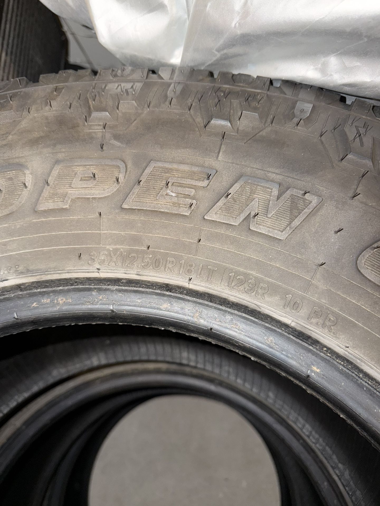 35x12.5X18 A/T Open Country Toyo Don’t fit my truck. Nice tires, have more than half tread & got all 4 no issues! No low ball and no flakes. Serious inquiries only.