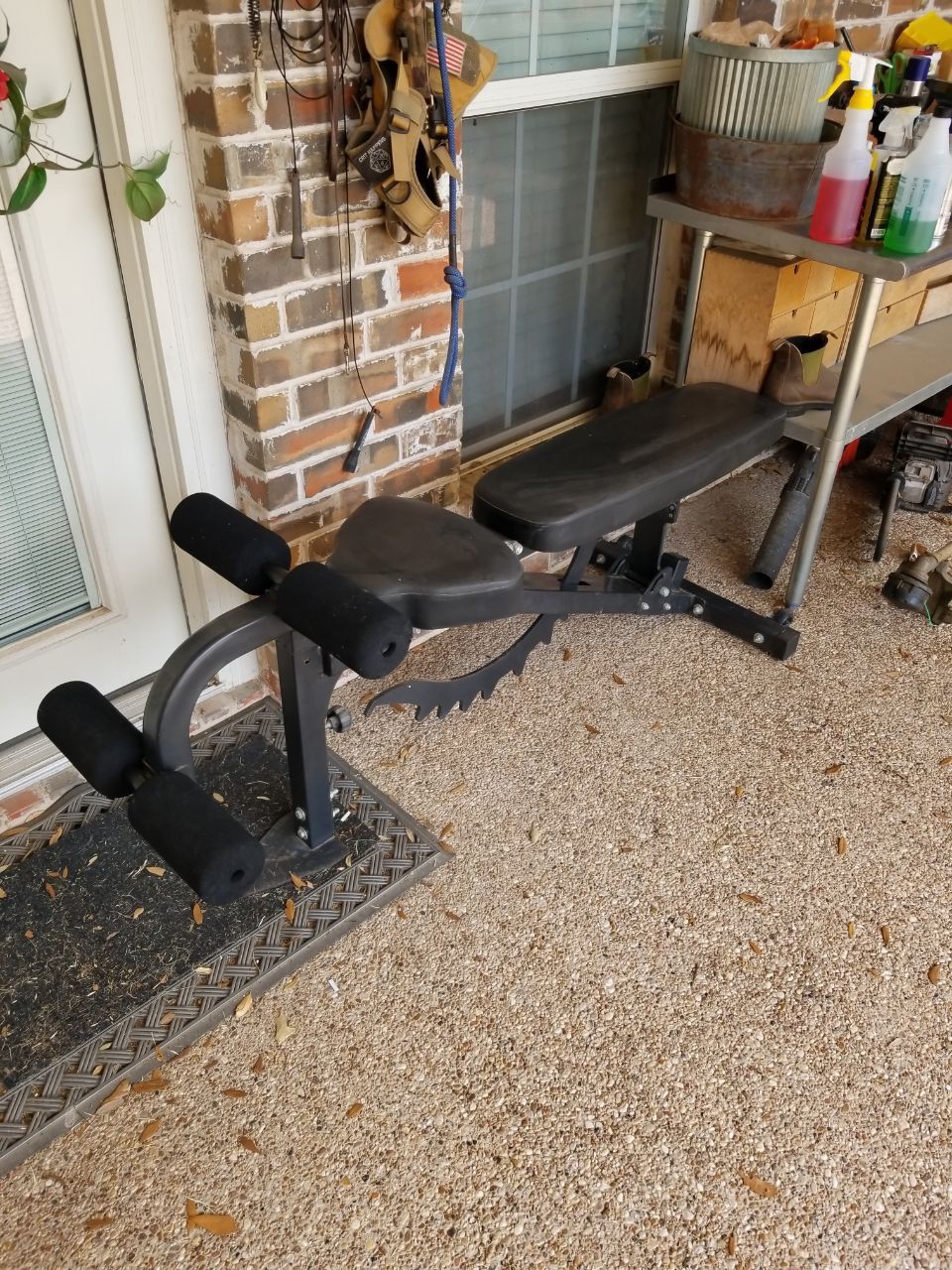 Has been sitting under a covered porch for awhile and we no longer use it. It’s nice and sturdy and has a leg extension (holds you down) insert