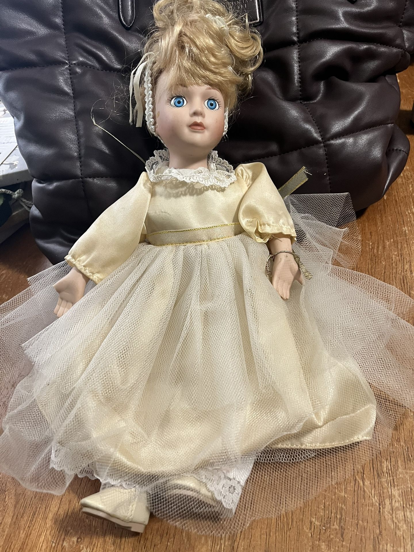Vintage Porcelain Doll it plays music as well tag says San Francisco music box company open to offers