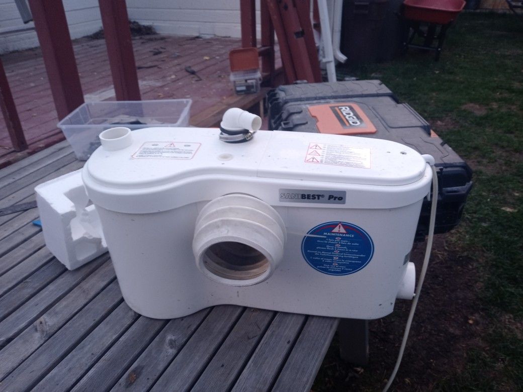 Saniflo sanibest Pro 013 turn grinder for hooking up plumbing anywhere you are having to go to a smaller than needed drain pipe or having to pump waist upstairs. Previous renters bounds this went up with a Q-tip. I opened it up saw the Q-tip in the grinder wheel. Cleaned out the entire inside and remove the obstruction. It works fine now. These run brand new for about a thousand to $1,200. Comes with extra plumbing fittings and the manual.