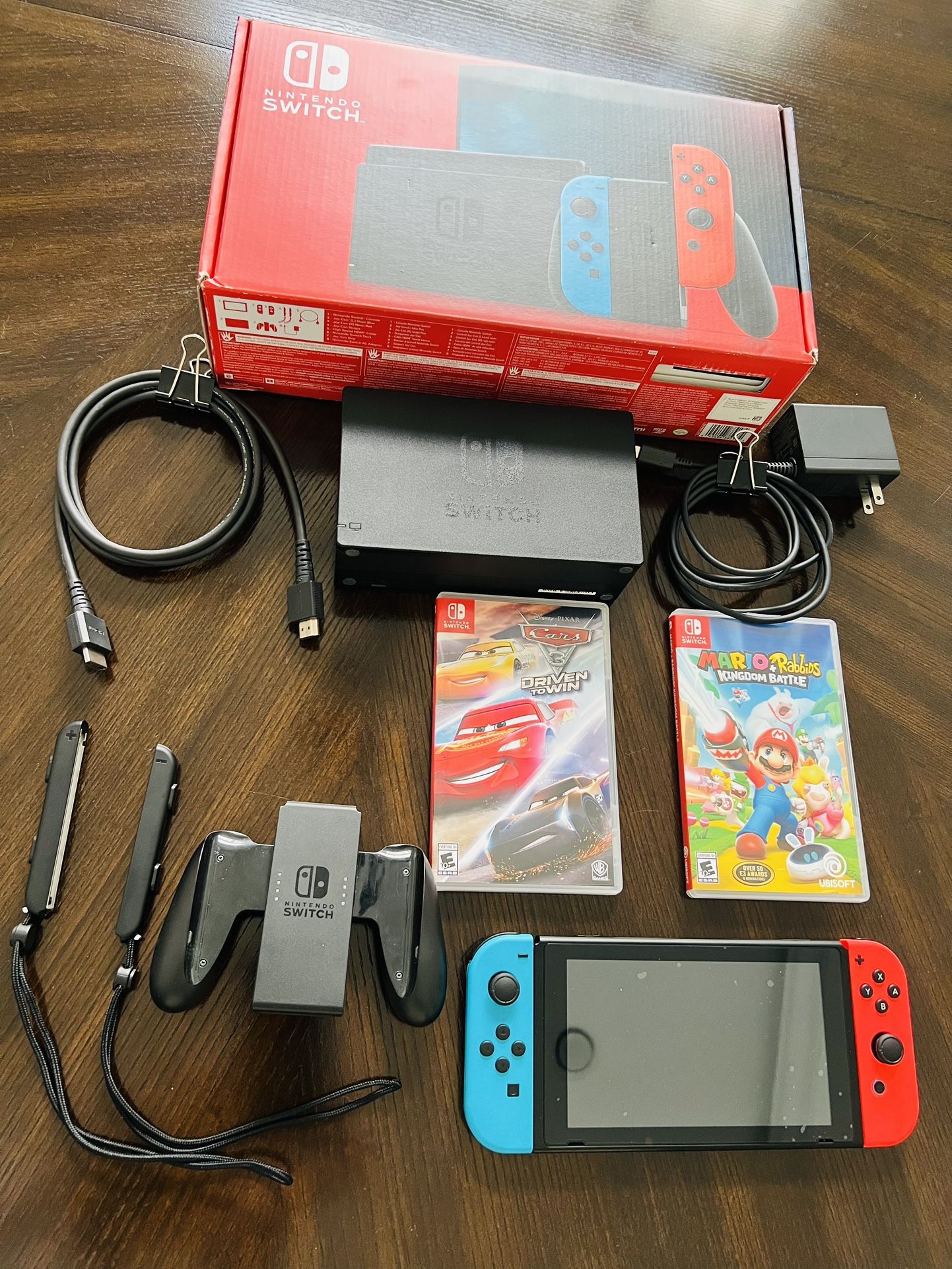 Complete game console kit with power supply, HDMI cable, TV dock, joysticks, screen protector - already on the console, original box. Bonus two games: Mario+Rabbids Kingdom Battle Cars Driven to Win Gently played and well taken care of. From smoke free home. Everything in pictures is in like new condition.