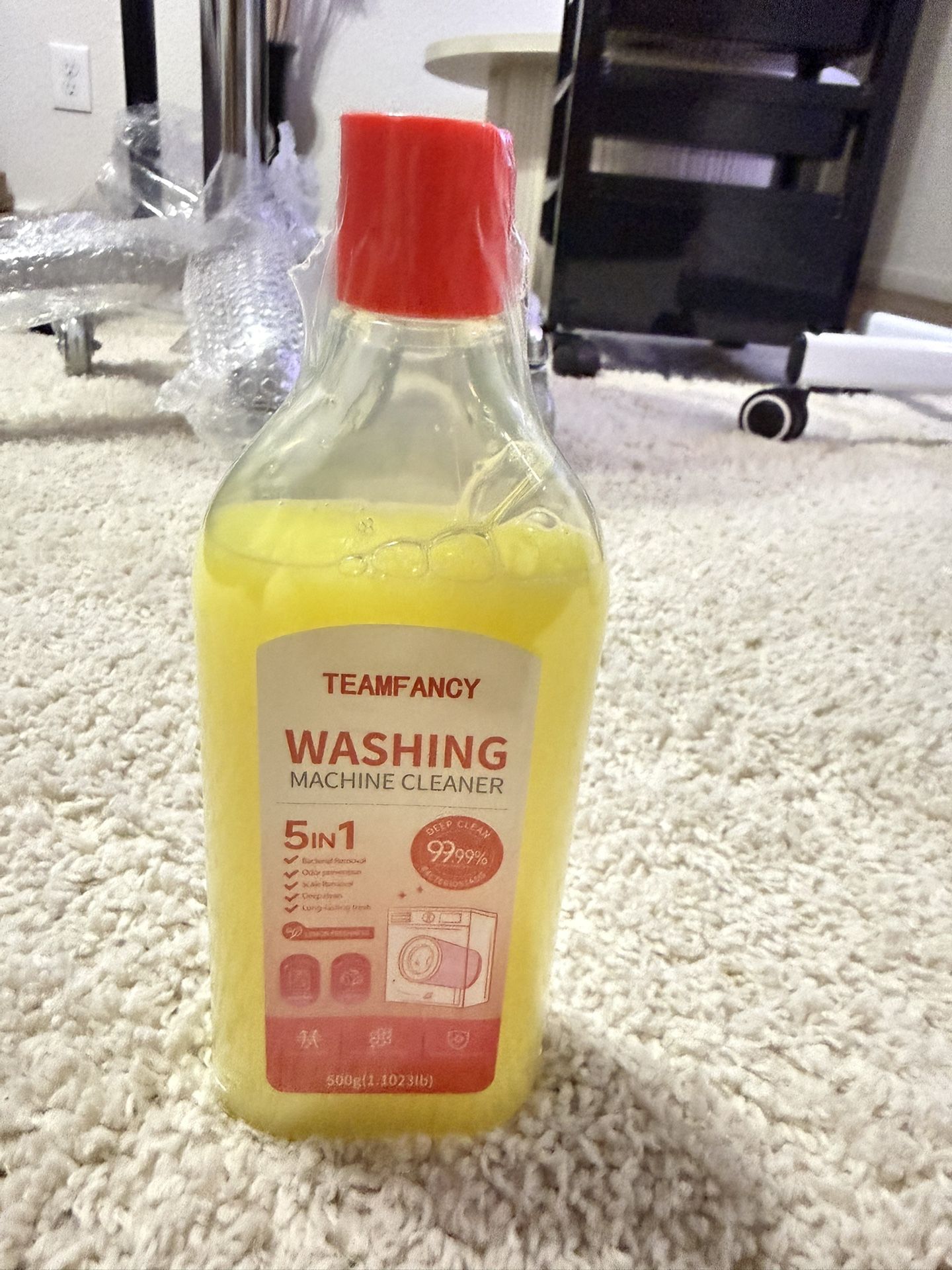 New TEAMFANCY washing machine cleaner, still sealed. This stuff is 5 in 1 for a deep clean, gets rid of bacteria (99.99%!), odors, and scale. Plus, lemon freshness. Bottle is 500g (1.1023lb). Good for keeping your washing machine drum super clean. Just remember, keep it away from kids, don't use on clothes, and no mixing with bleach or other cleaners. I have 48 x $160