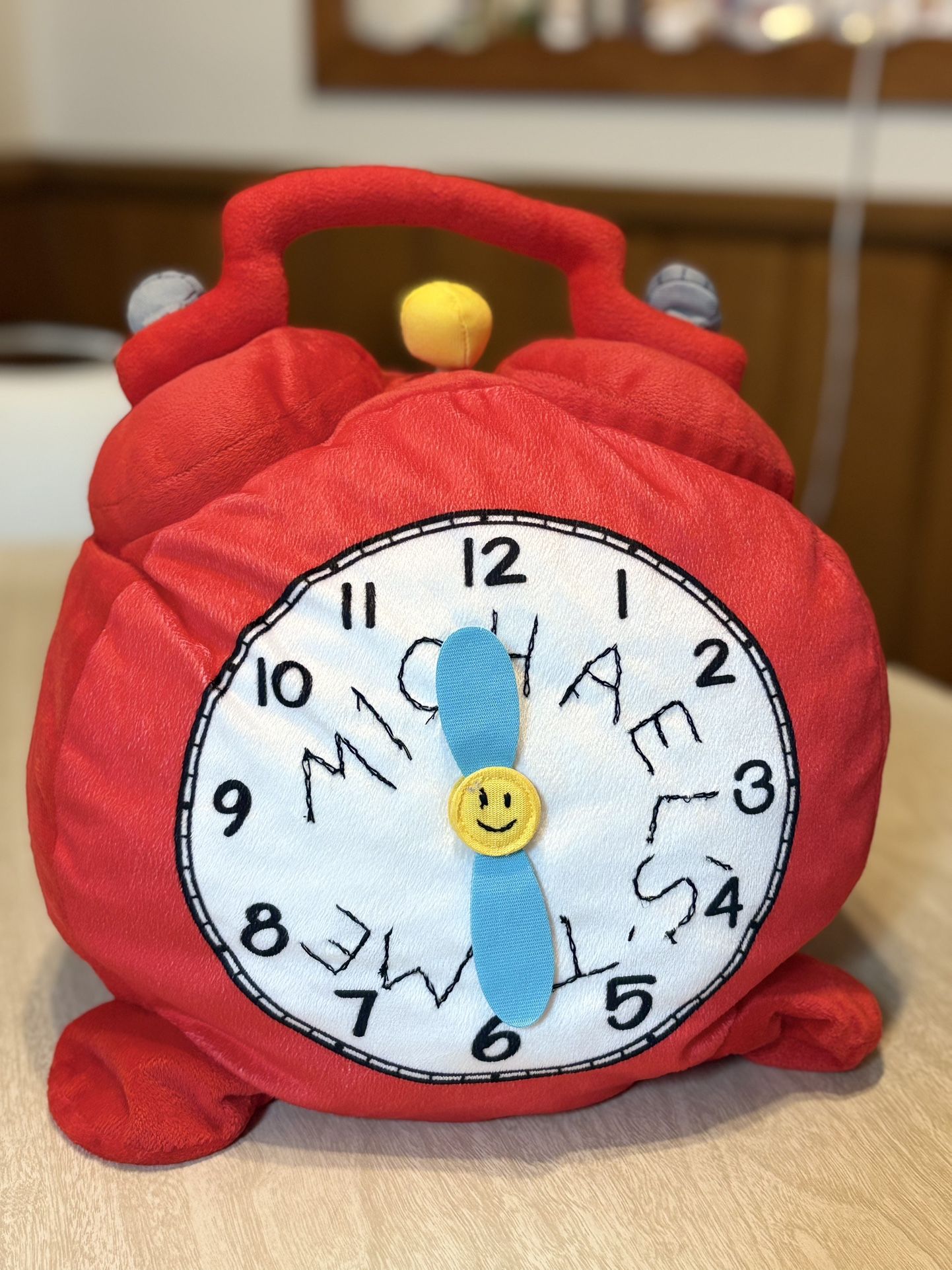 Red plush clock with smiley face and blue hands. This is an IKEA Hemmahos red plush alarm clock toy. Made of soft, plush material suitable for cuddling. Features movable hands, which can help children learn to tell time. Approximately 37 cm (about 14 inches) tall. Part of IKEA's collection of soft toys designed for kids.