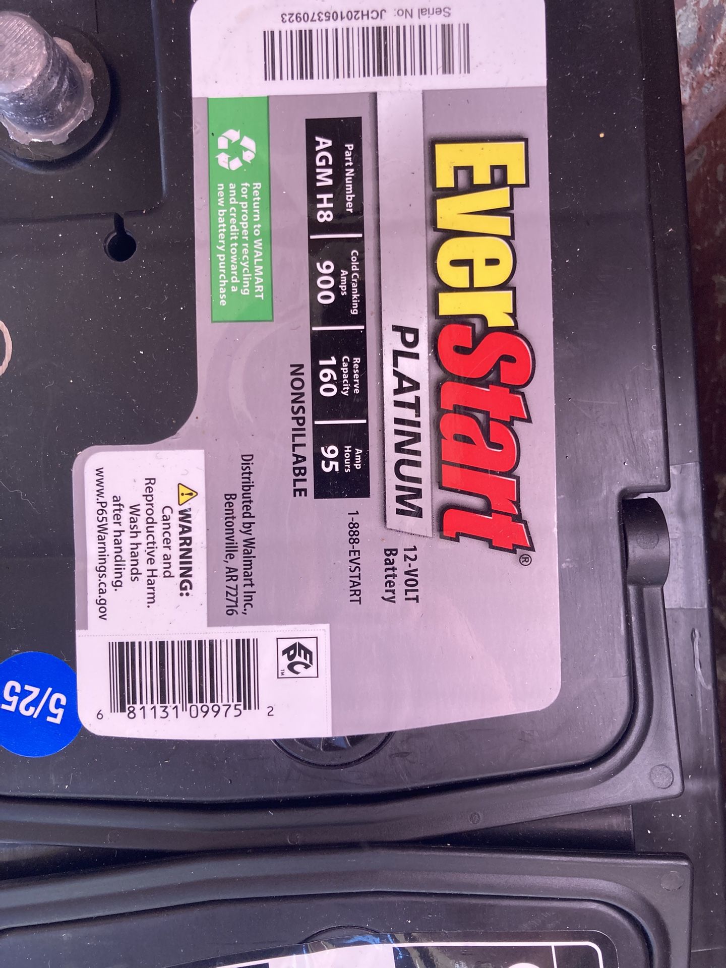 Selling an EverStart Platinum AGM H8 battery, never used, bought 45 days ago. 900 cold-cranking amps (CCA) 160 reserve capacity