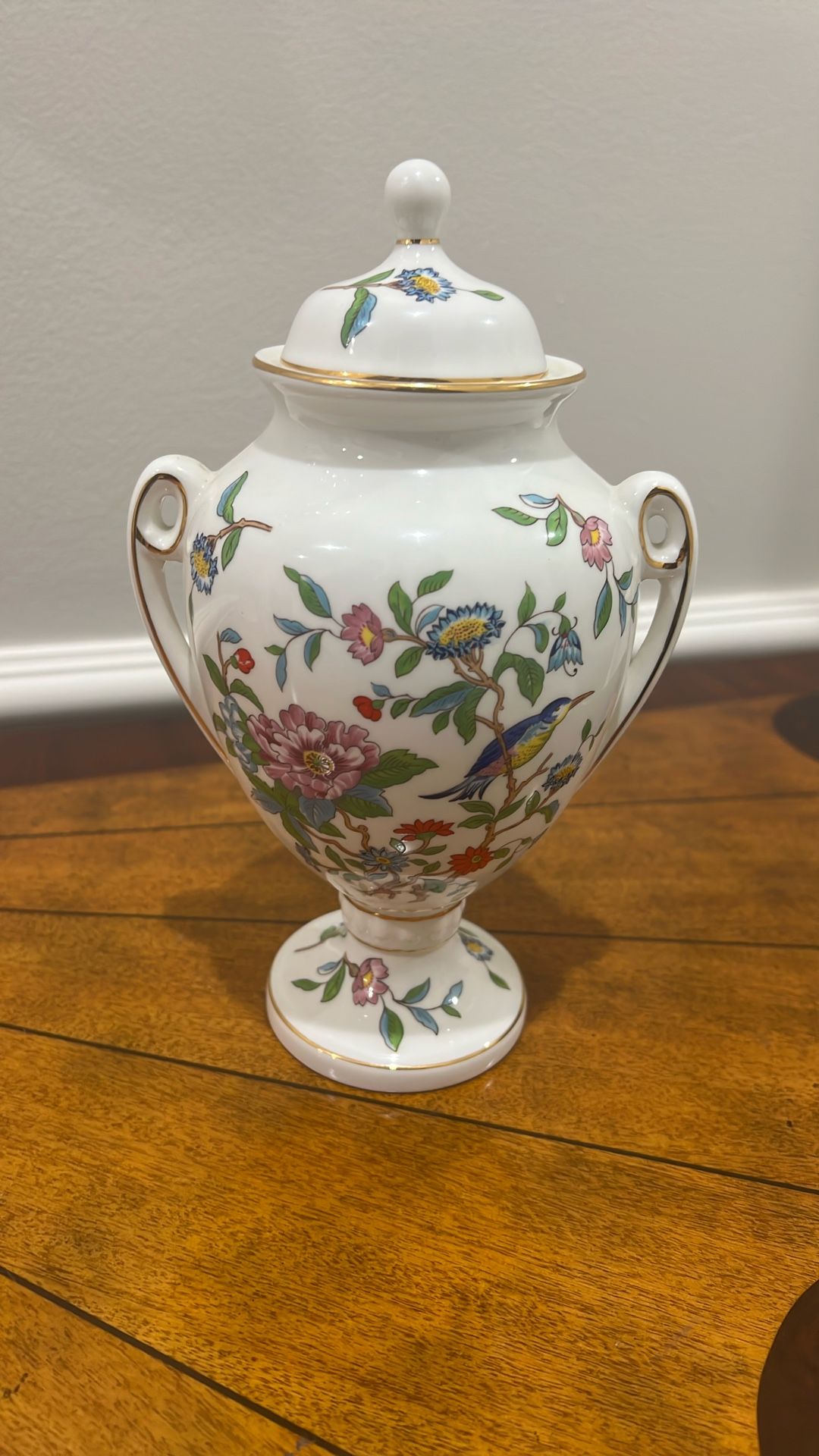 It features the popular "Pembroke" pattern, which is an Oriental-inspired motif of a bird on a branch with colorful flowers and leaves. The piece is crafted from fine bone china and includes gold trim accents 9 in tall 5 in wide