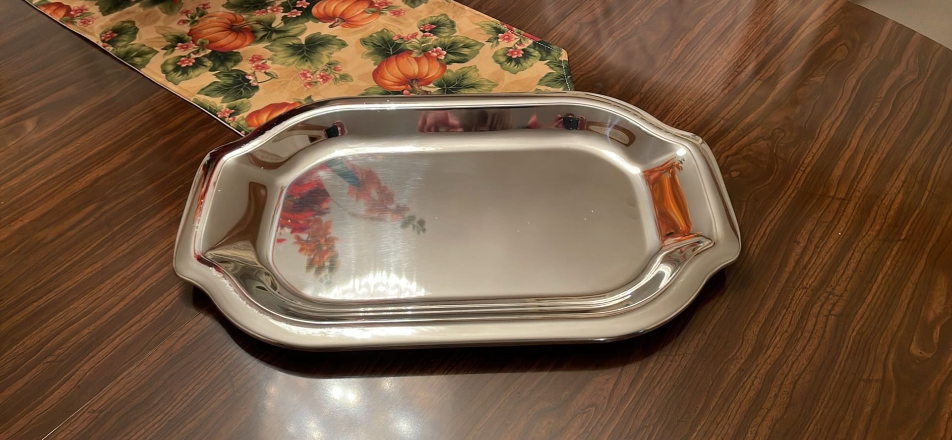 vintage Farberware serving tray. Product: Far Stainless Steel Serving Tray Manufacturer: Farberware Material: Stainless Steel