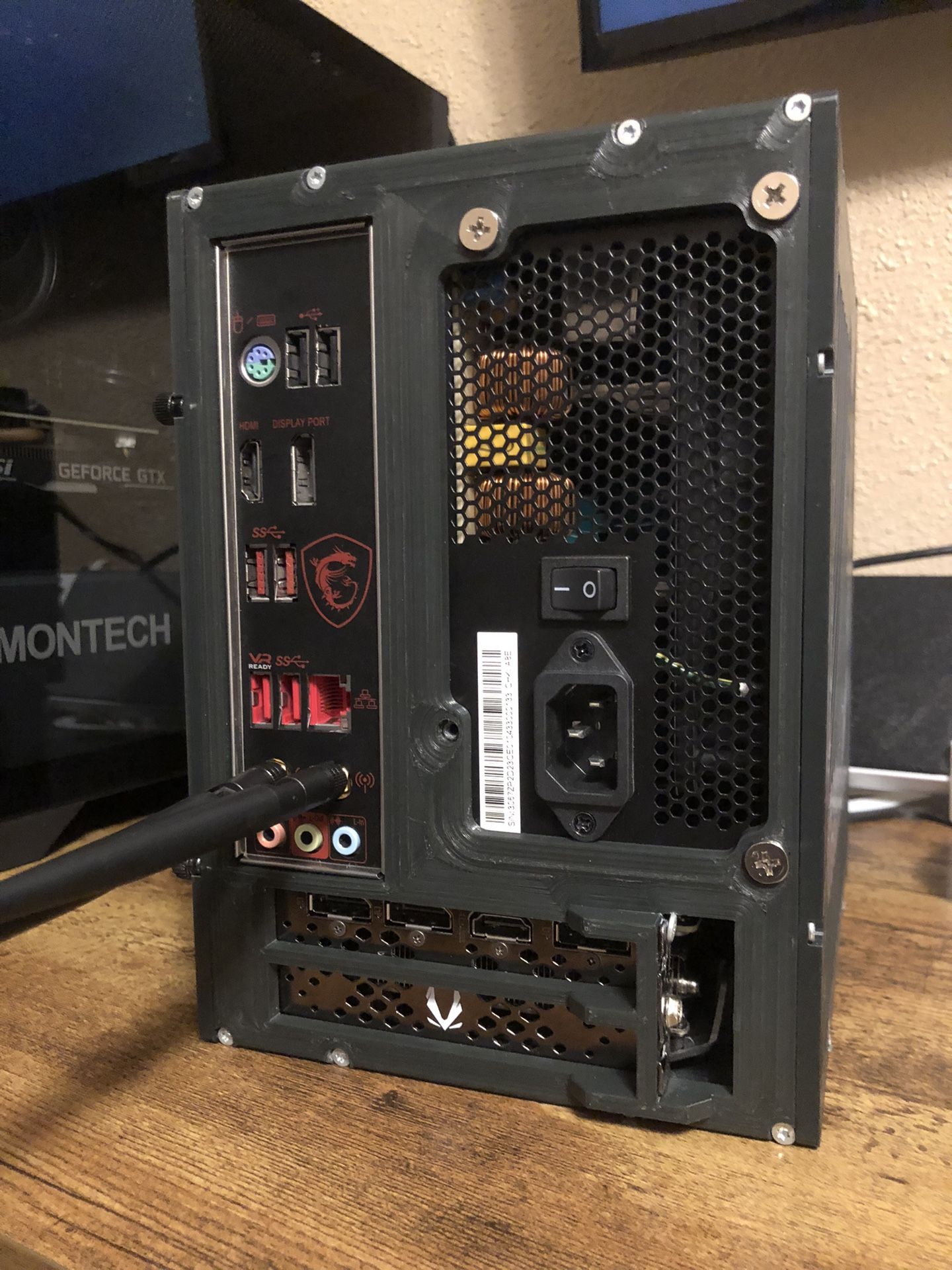 It’s a mini pc I made with a 3d printed case with a power button Zotac rtx 4060 gpu Ryzen 7 2700 cpu 16gb ram crosshair ddr4 750 watt mag psu Msi itx motherboard 512 gb nvme Xbox controller is just for scale it’s pretty small and quite due to the 140mm fan I put in the front Ask questions always available Want to bundle with my rog ally for a cheaper price for both