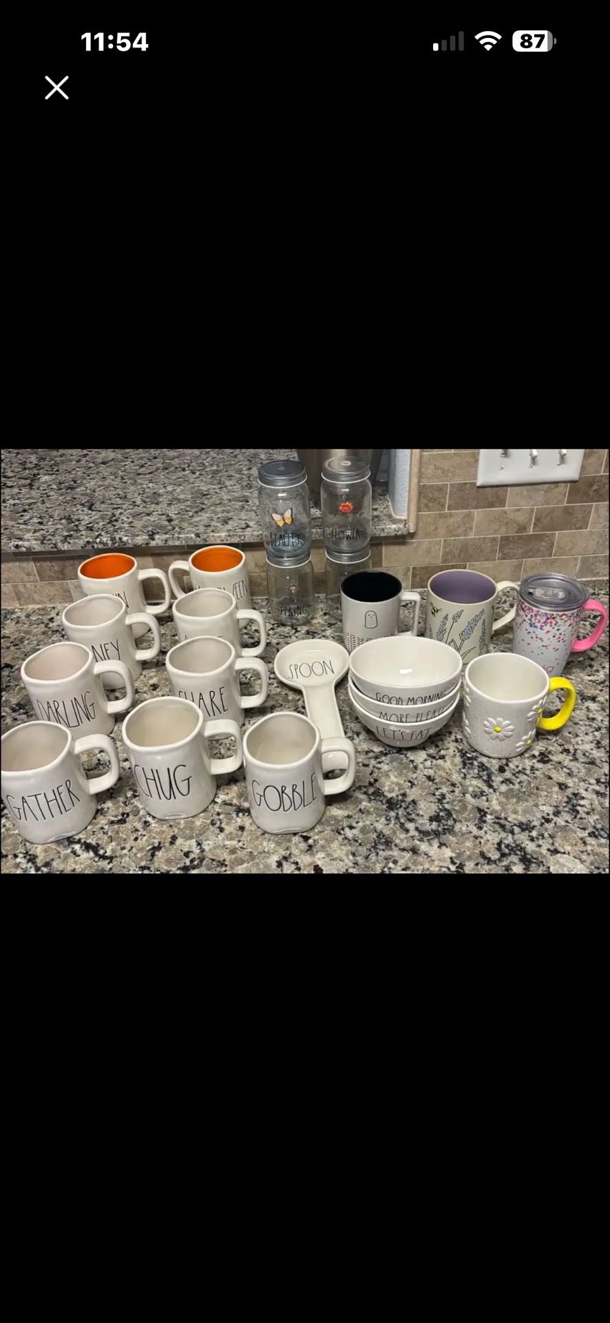 Group includes 12 mugs, 3 bowls, spoon rest, 4 mason jar cups All in good condition Mostly all Rae Dunn