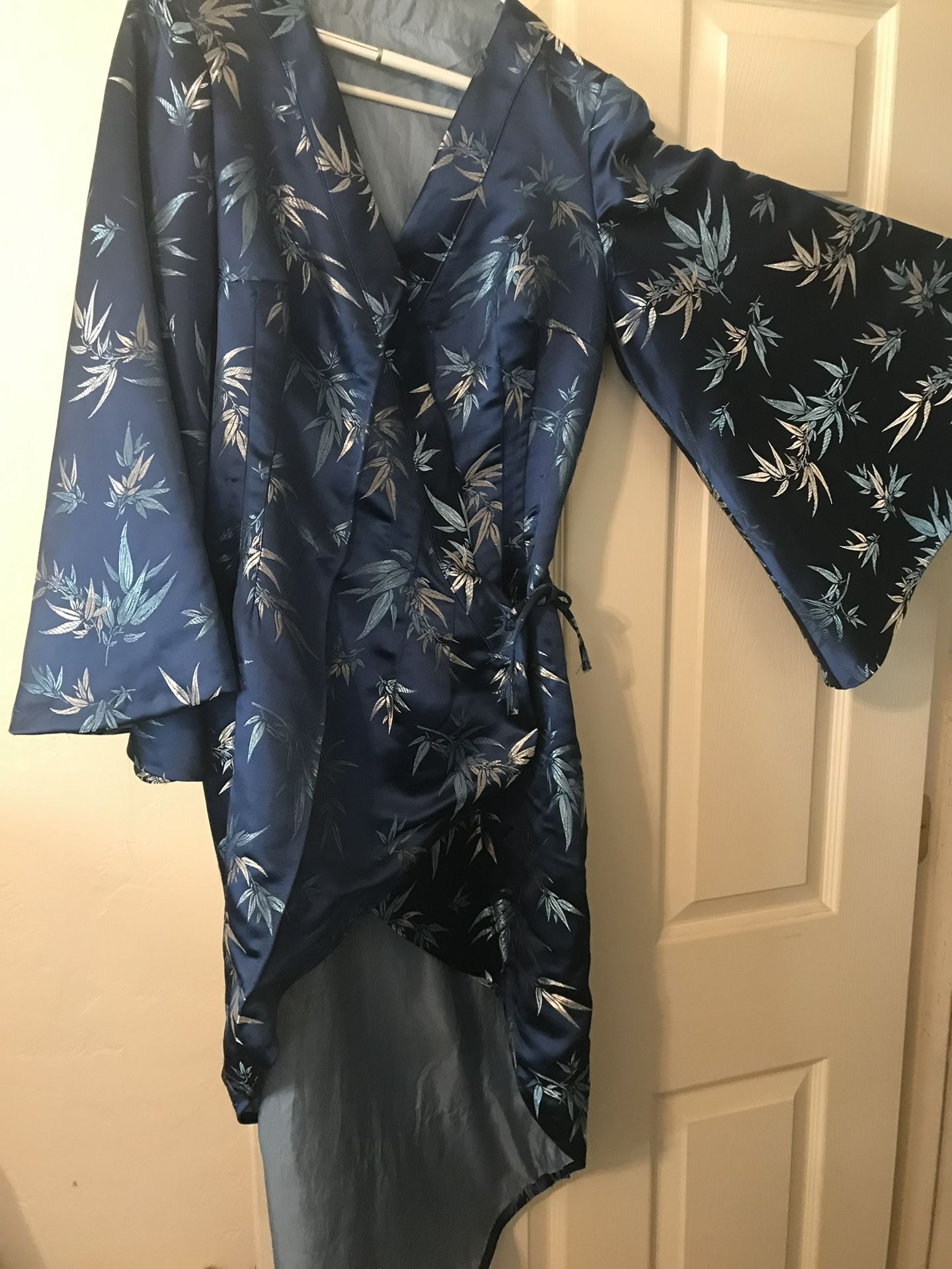 Beautiful satin robe. Small to medium woman’s size. Never worn. Dark blue background.