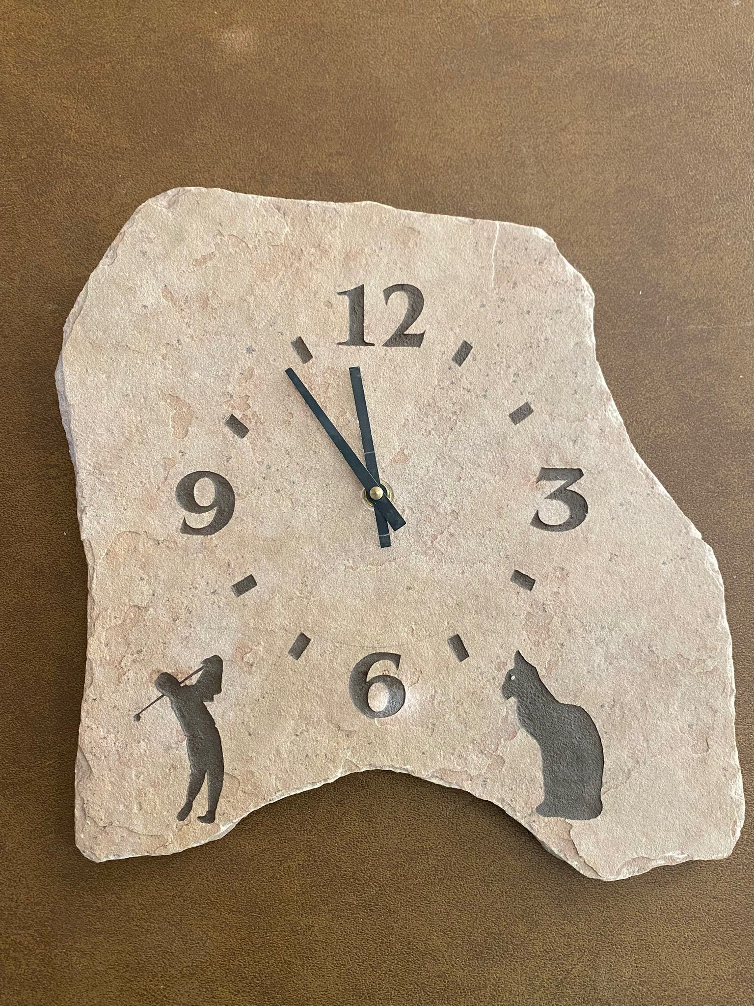 This is a one of a kind sandblastedclock on flagstone approximately half inch thick or a little more. The design is a cat and a golfer it is a AA battery operated quartz movement it has a hanger on the back to hang it on the wall inside or out. When sold in retail stores anywhere from $45-$65. These are some of the designs that we had Left over when we’re retired and sold our store.