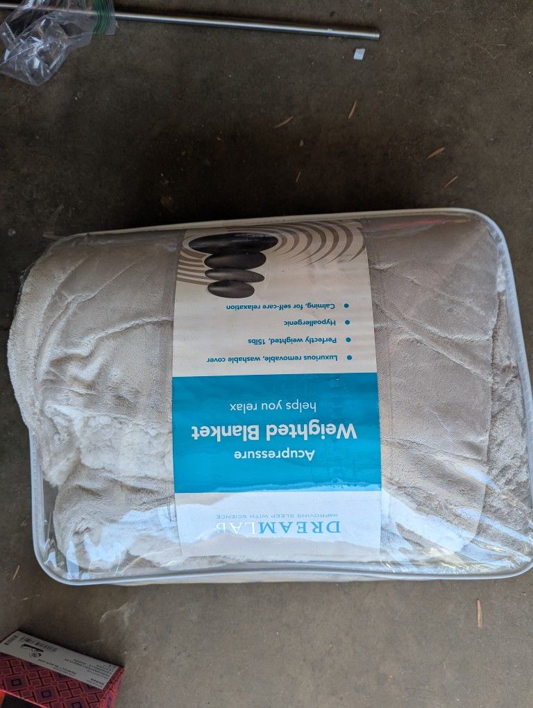 Grey microfiber weighted blanket. 15 lbs, size 48" x 72". Like new, package was opened but blanket wasn't used.