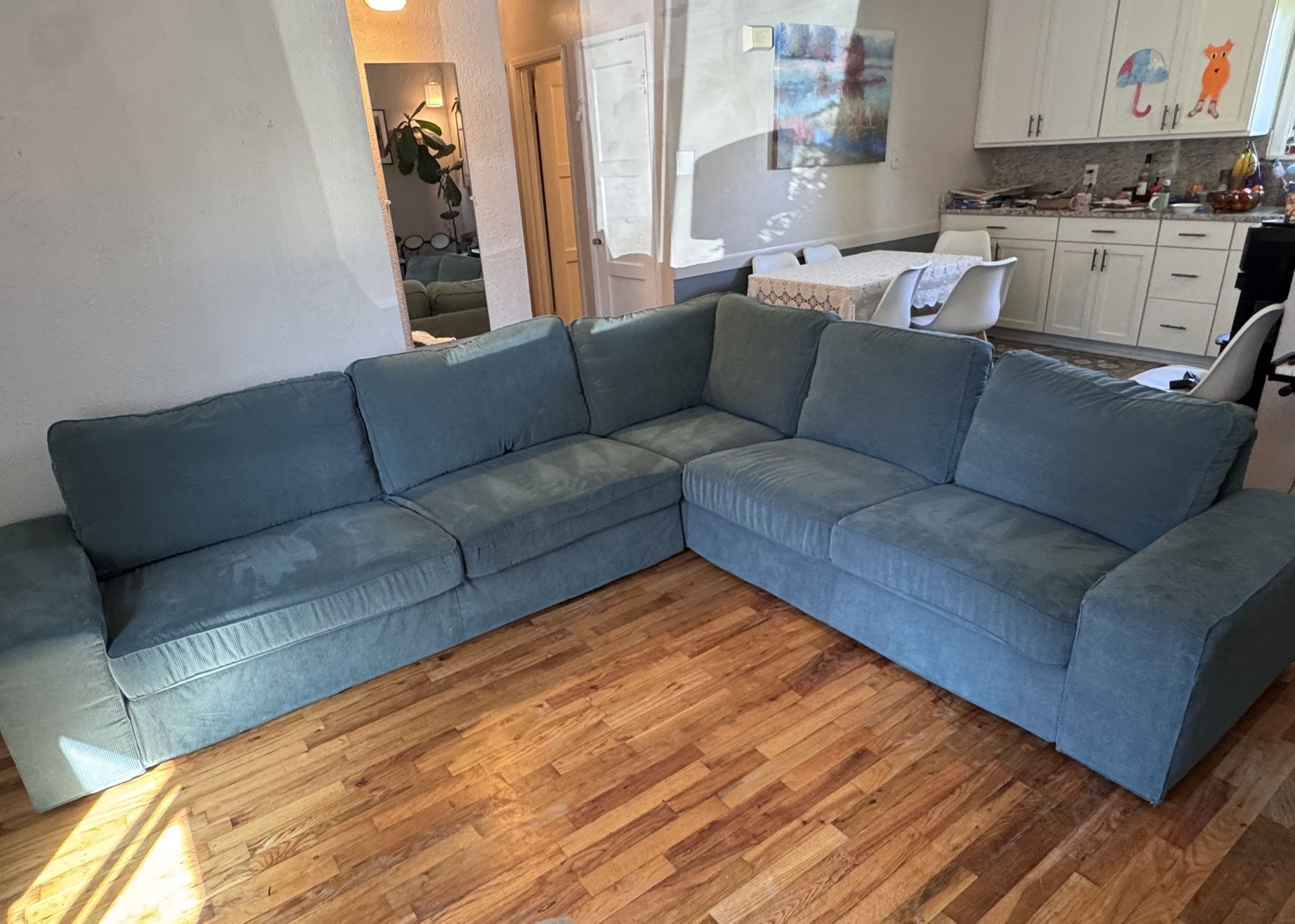 Used in Great Condition! Solid and clean piece of furniture, comes apart in 3 pieces. Easy to reassemble. All pillow and couch cushions are removable for washing. Bought new, non-smoking home. Product details Enjoy the super comfy KIVIK sofa with deep seat cushions made of pocket springs, high resilience foam and polyester fibers – adding both firm support and relaxing softness. The size and depth of the sofa make it perfect for a nice nap or when the whole family is gathered. There is room for everyone and even extra seating on the wide armrests. The wide armrests have room for everything from your mobile phone to a bowl of movie snacks and very comfortable to lay your head on when you lie down on the sofa for a rest. KIVIK sofa has a strong personality and a clear design language, while the options mean that you can easily match it with your home decor. It is easy to combine the sofa with one or more chaise lounges thanks to the removable armrests. Pocket springs are a durable solution that makes the sofa retain both its shape and comfort for many years. The cover is easy to keep clean since it can be machine washed and is easy to take off and put on again.