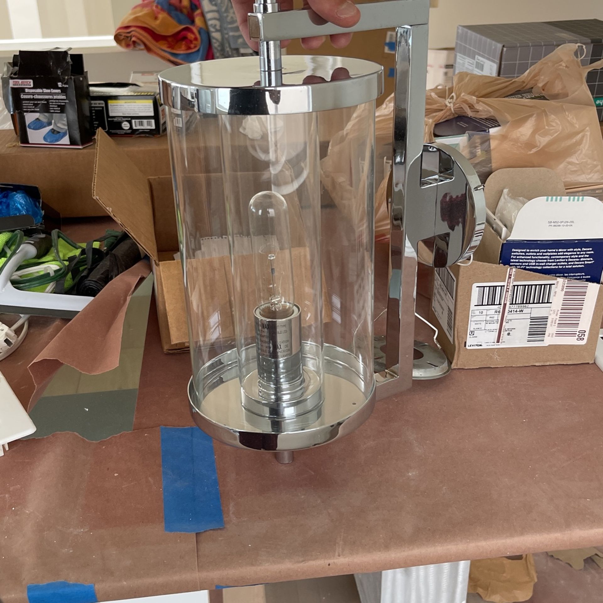 Comes with frosted and clear inner tubes. Restoration hardware outdoor sconce in chrome.