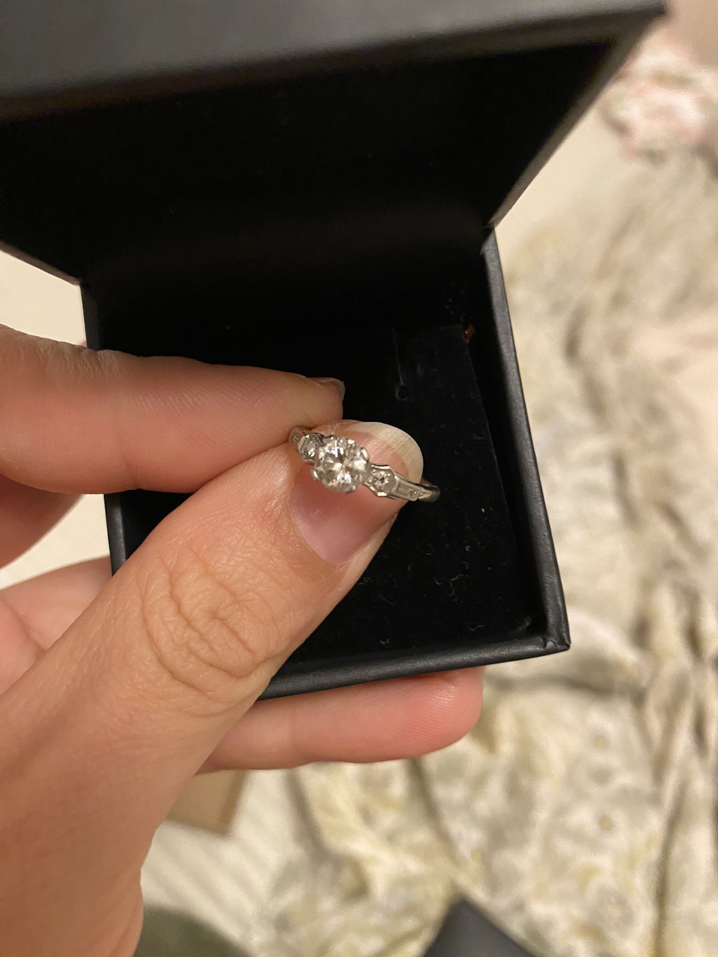 Selling my antique engagement ring. I believe it’s a size 5.5. It’s hard to get a good photo of it so I have added a few more, but the photos don’t do it justice. It’s very dainty and quite lovely for someone with slender hands. I don’t have paperwork for it but I have had it checked out and they are real diamonds on a platinum band. It does need to be cleaned. I don’t remember the total carat of the main diamond. There are two small round diamonds on the side and 2 small baguette diamonds. Very art deco. It was purchased for around $1200, I’m asking $700 OBO.