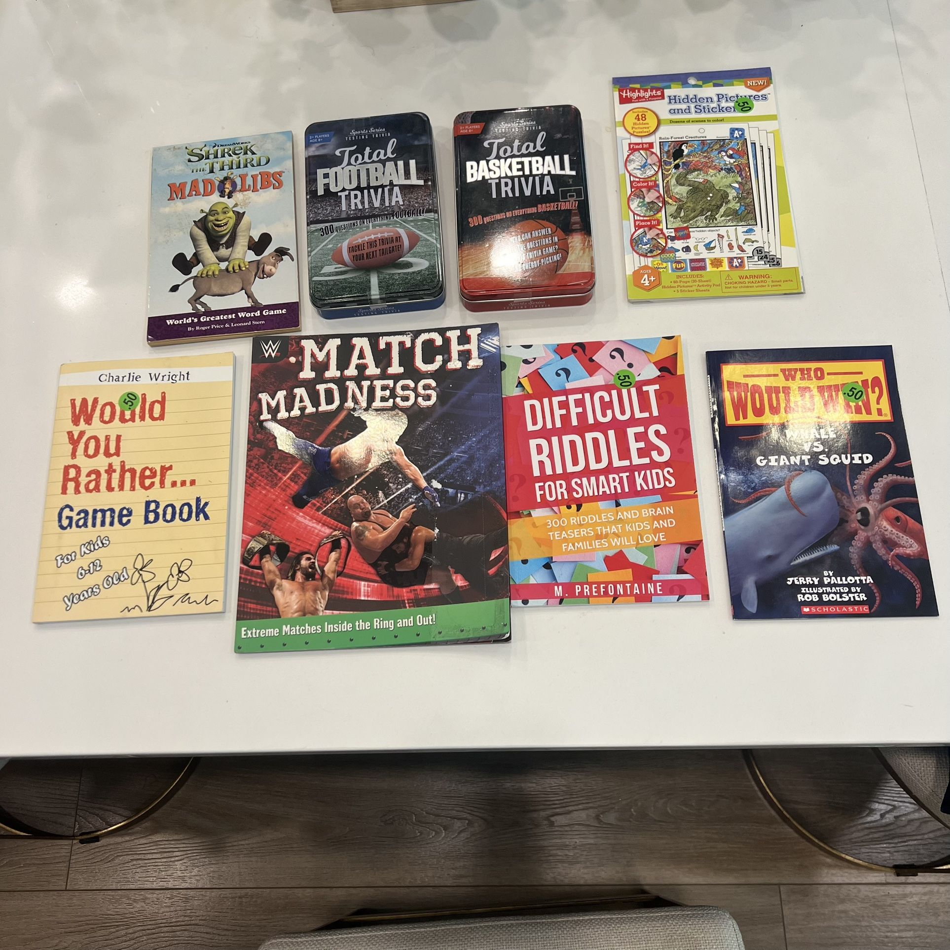 Would you rather? Riddles Who would win? Two trivia games. Football and basketball. Never opened. Hidden pictures and stickers - this book is missing six stickers. No pages have been used. All of the books with the exception of the highlights hidden pictures book have never been used. Trivia games have never been opened. See picture to see seal on containers. Non smoking home