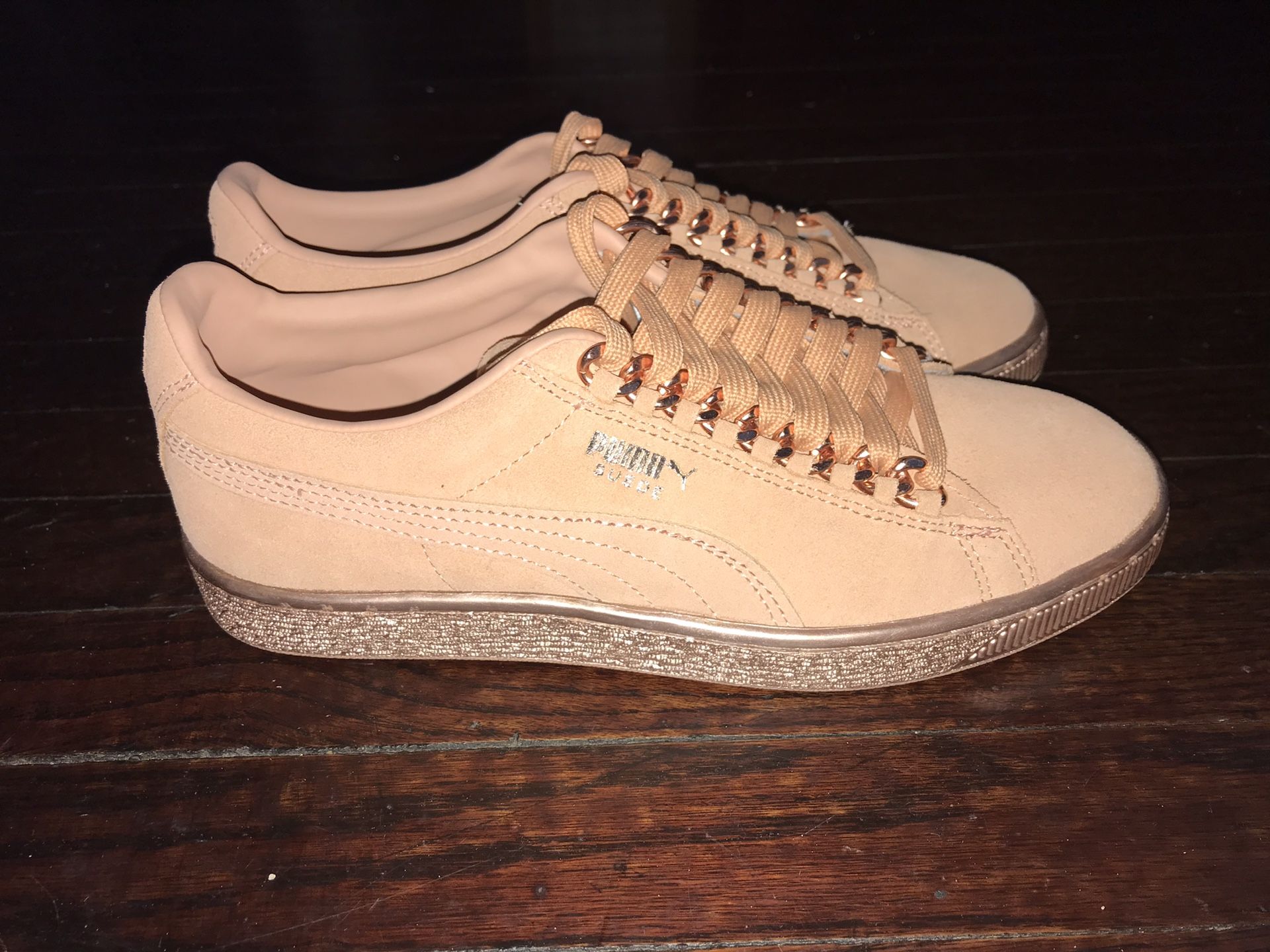 PUMA Brand new Size 6.5y No box Suede Classic x Chain Kids lifestyle low top sneaker Suede upper Lace closure with synthetic chain lace lock Foamstrips on sides Suede tongue with PUMA cat branding Color: Dusty Coral-Rose Gold