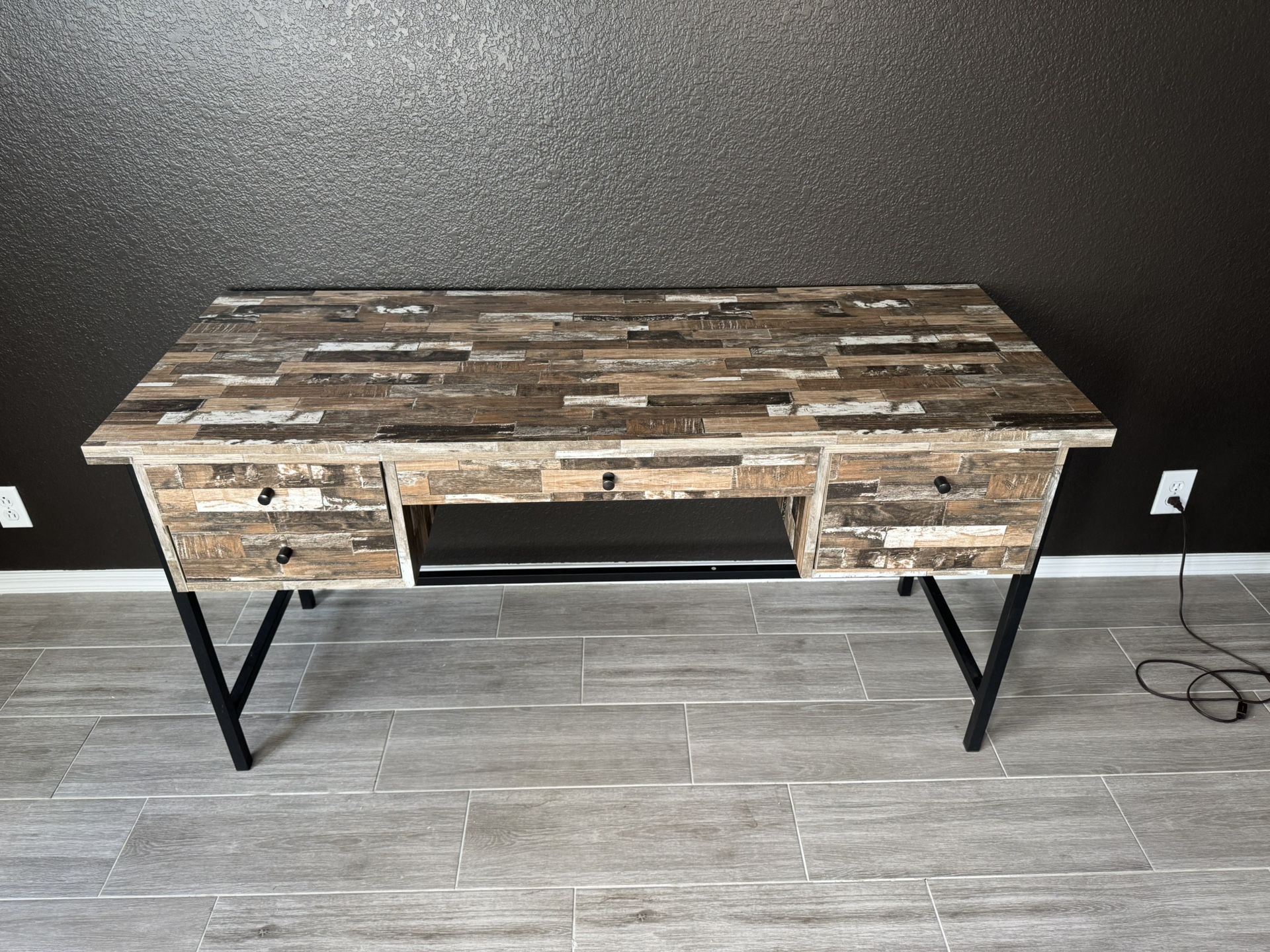 Beautiful wooden textured large computer desk With black metal legs!! Very cool pattern!! This will make the perfect addition to your home office. Great condition!! Large and spacious for all of your office supplies. Pick up only.