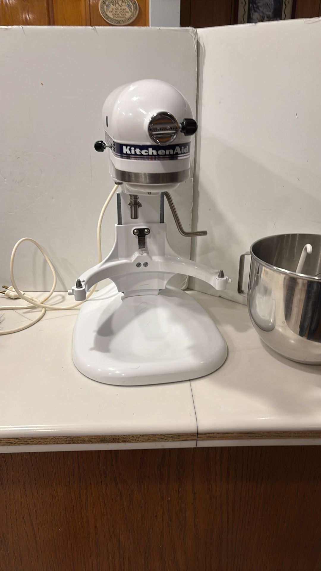 Comes with 3 Attachments…The KitchenAid Proline KMS5 White Countertop Stand Mixer is a high quality kitchen appliance that comes in a sleek White finish. It includes a stand mixer with various attachments making it versatile for a range of mixing and blending tasks The KitchenAid brand ensures durability and reliability, making it a popular choice for those looking for a professional-grade countertop mixer for their kitchen. The Holidays are just around the corner. This mixer is in great condition