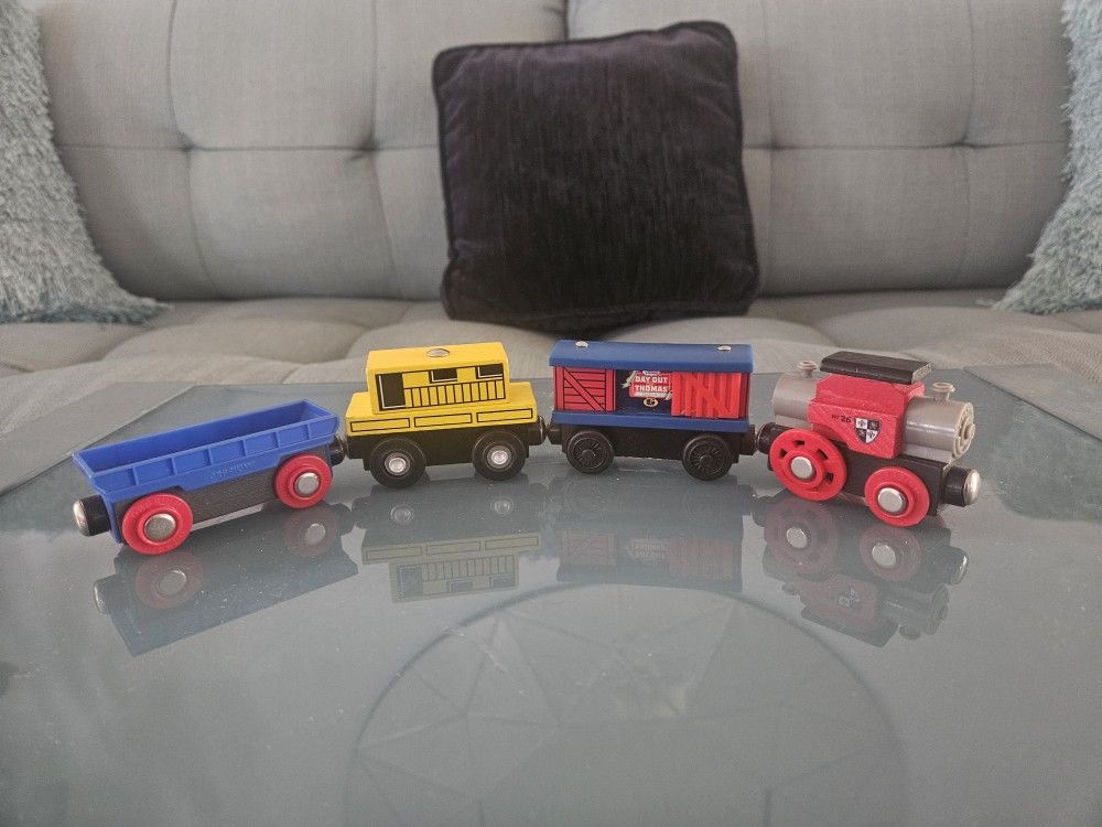 Wooden train set no tracks just train in photo.