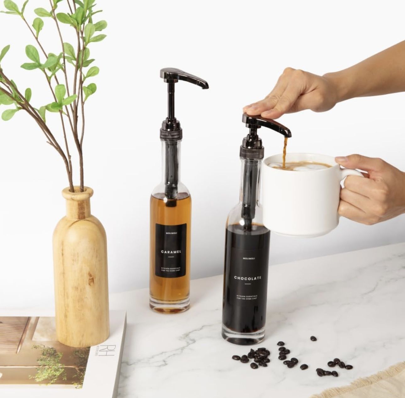 New in the box! Molimoli Set of 2, 350ml, Coffee Syrup Dispenser for Coffee Bar, Coffee Pump Dispenser, Glass Syrup Bottle w. Pumps, Simple Syrup Dispenser