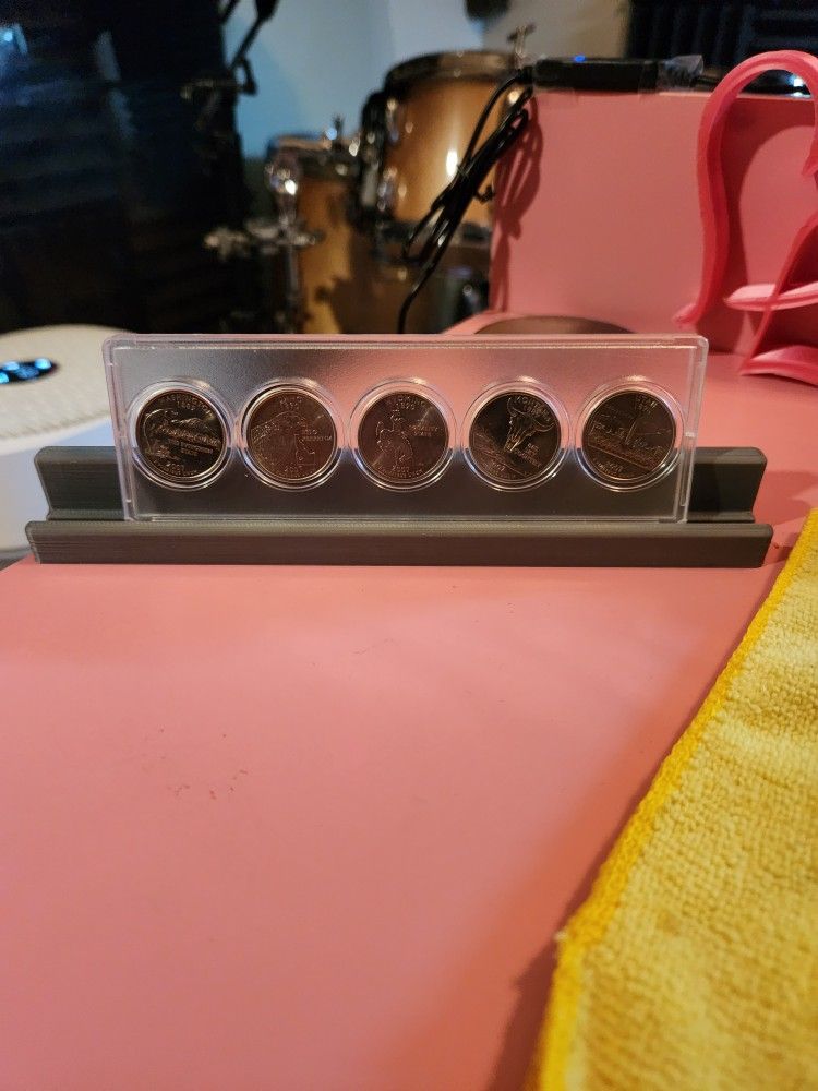 2007 State Quarters are Washington, Idaho, Wyoming, Montana, and Utah. Size of case is 6" x 2". All handpicked in mint condition. Coins are more valuable if in original condition. Can be cleaned if you want me to. Just let me know. The stand comes separately and in various colors. They are 3D prints made from colored filament. $3 a piece. Size is 7 3/4" x 1".