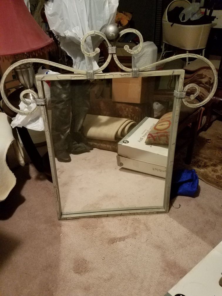 Mirror; metal; sage green and gray crackle finish-, heavy - $15