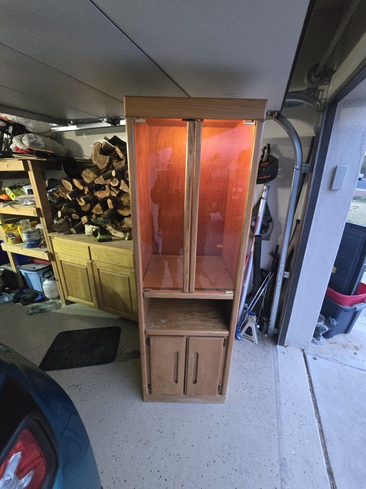 This is nice Oak Cabinet for your collectables and trinkets. It is used but is very sturdy. It does have signs of ware on the sides from being moved. As you can see in the picture it is lighted and has three glass shelves with pegs and has a cubby hole type shelf and a deep lower cabinet as well.