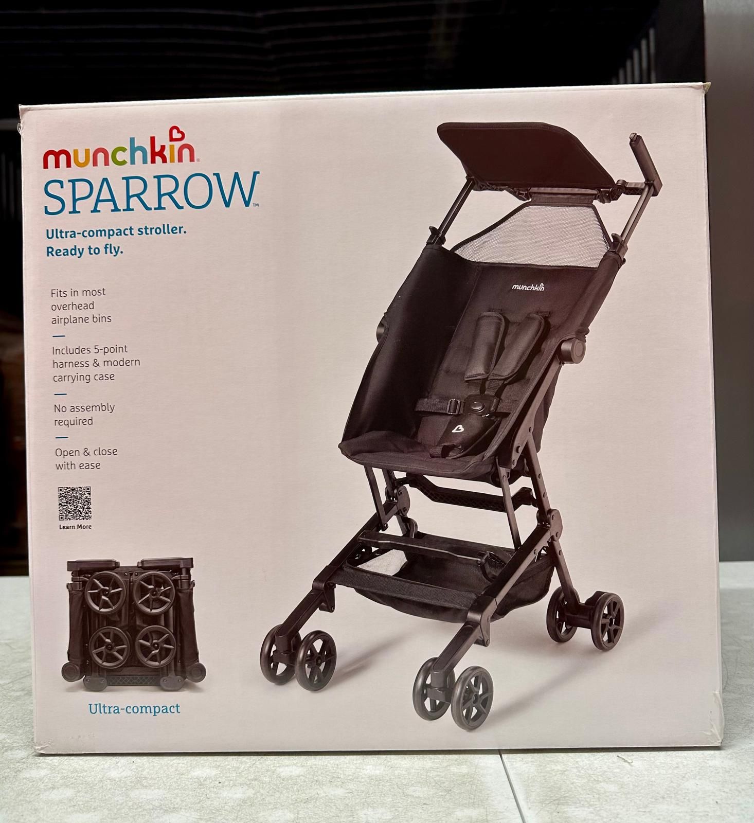The Munchkin Sparrow Ultra Compact Stroller in Black is designed for families who want to travel light while maintaining comfort and safety. Lightweight and easy to carry, this stroller folds down compactly to fit in most airplane overhead bins, making it ideal for travel, errands, and everyday adventures. The stroller is ready to use right out of the box with no assembly required. Simply unfold and go. It includes a modern carrying case for easy packing, a sun shade for added coverage, and a convenient storage basket for everyday essentials. The mesh headrest provides airflow to help keep your child cool and comfortable while on the move. Designed for babies and toddlers who can sit upright unassisted, the Sparrow features a secure 5-point harness and a compact frame that is best used at a normal walking pace. Its lightweight design makes it easy to maneuver and store when not in use. Features Lightweight, ultra-compact collapsible stroller Fits in most overhead airplane bins No assembly required, ready to use out of the box Secure 5-point safety harness Mesh headrest for comfort and ventilation Sun shade for added protection Storage basket for child and parent essentials Includes modern carrying case JPMA certified for safety Measurements Open dimensions: 18.5 in (W) x 39 in (L) x 28 in (H) Folded dimensions: 14 in (W) x 15 in (L) x 6.25 in (H) Weight: 12.8 lb