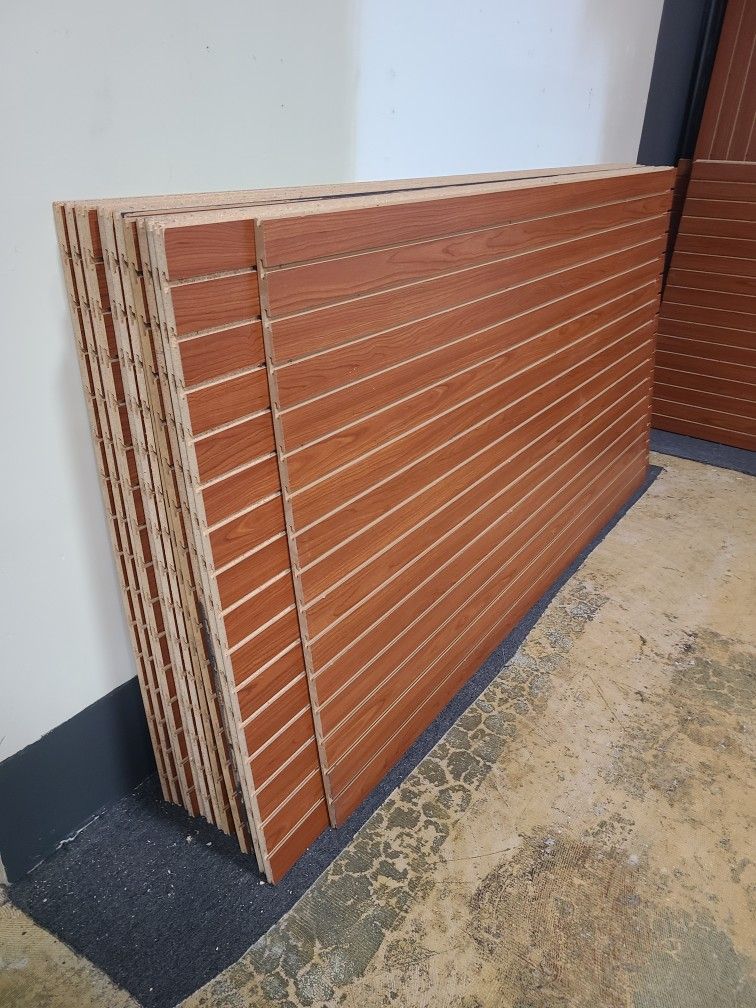 QTY of 15: 4' x 8' Slatwall. Cherry Color Slatwall hooks available as well. QTY of 5: 4 Way Pin Wheel Floor Display, Slate Wall: 36" Deep x 36" Wide x 54" Tall