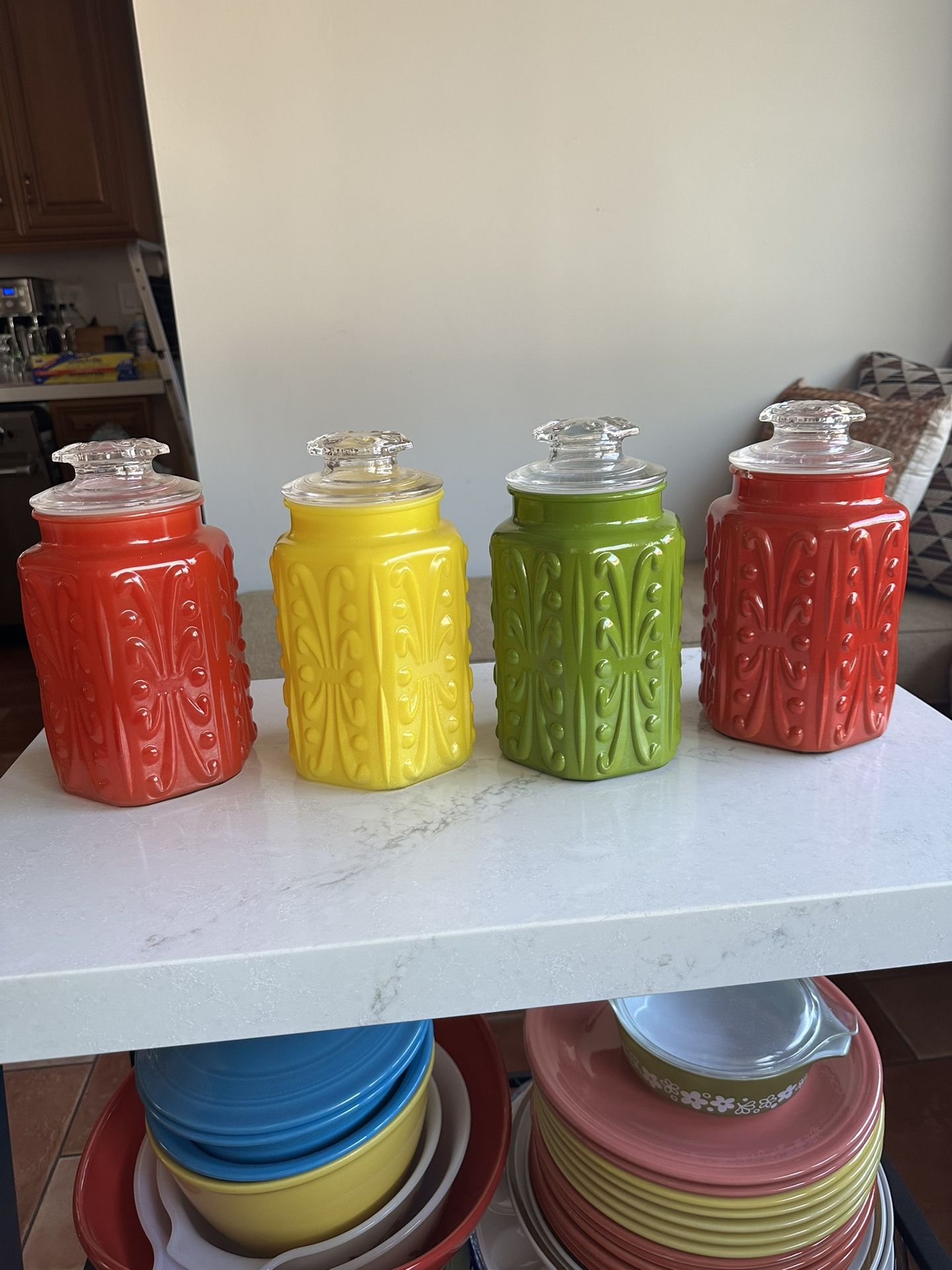 Beautiful and rare, excellent condition. Mid-Century, iconic colors. Great for food storage, can also be used in a bar, as flower vases or just for display. Check out my page for more cool stuff