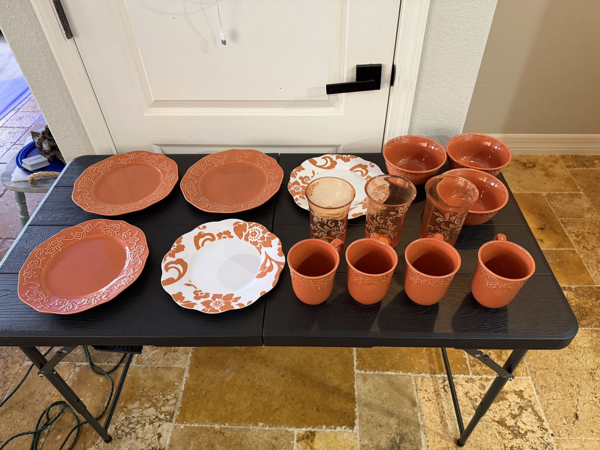 3 Stoneware Dried Peach plates 4 Stoneware Dried Peach mugs 3 Stoneware Dried Peach bowls 3 floral plastic cups 2 Citrus Blossoms melamine dinner plates feature a vibrant floral pattern in a color known as Dried Peach Entire set $30
