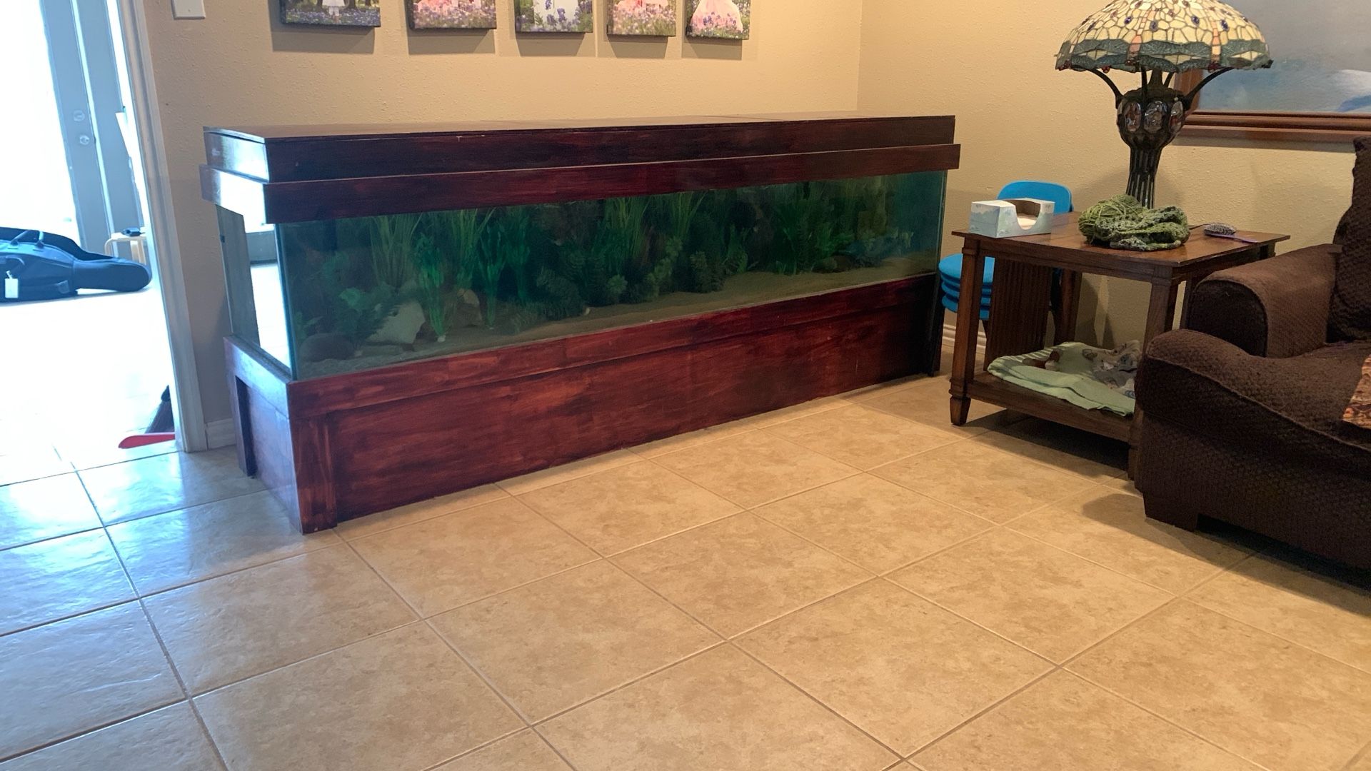 8 foot long x 21 in width x 24 in height Glass Showcase Aquarium. fully Built Wood cabinet bottom and hood top.