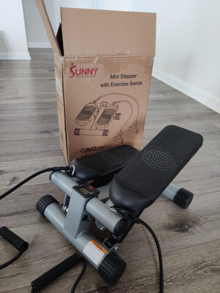 Sunny Mini Stepper with attached resistance bands. It was used only once and is practically brand new. It has an adjustable knob for resistance. It comes with an additional battery for the digital display.