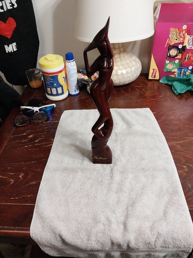 I don't know a lot of history about this item I just know it's a wooden statue of a woman with a hat that says St Lucia. It is pick up only and I prefer cash thanks