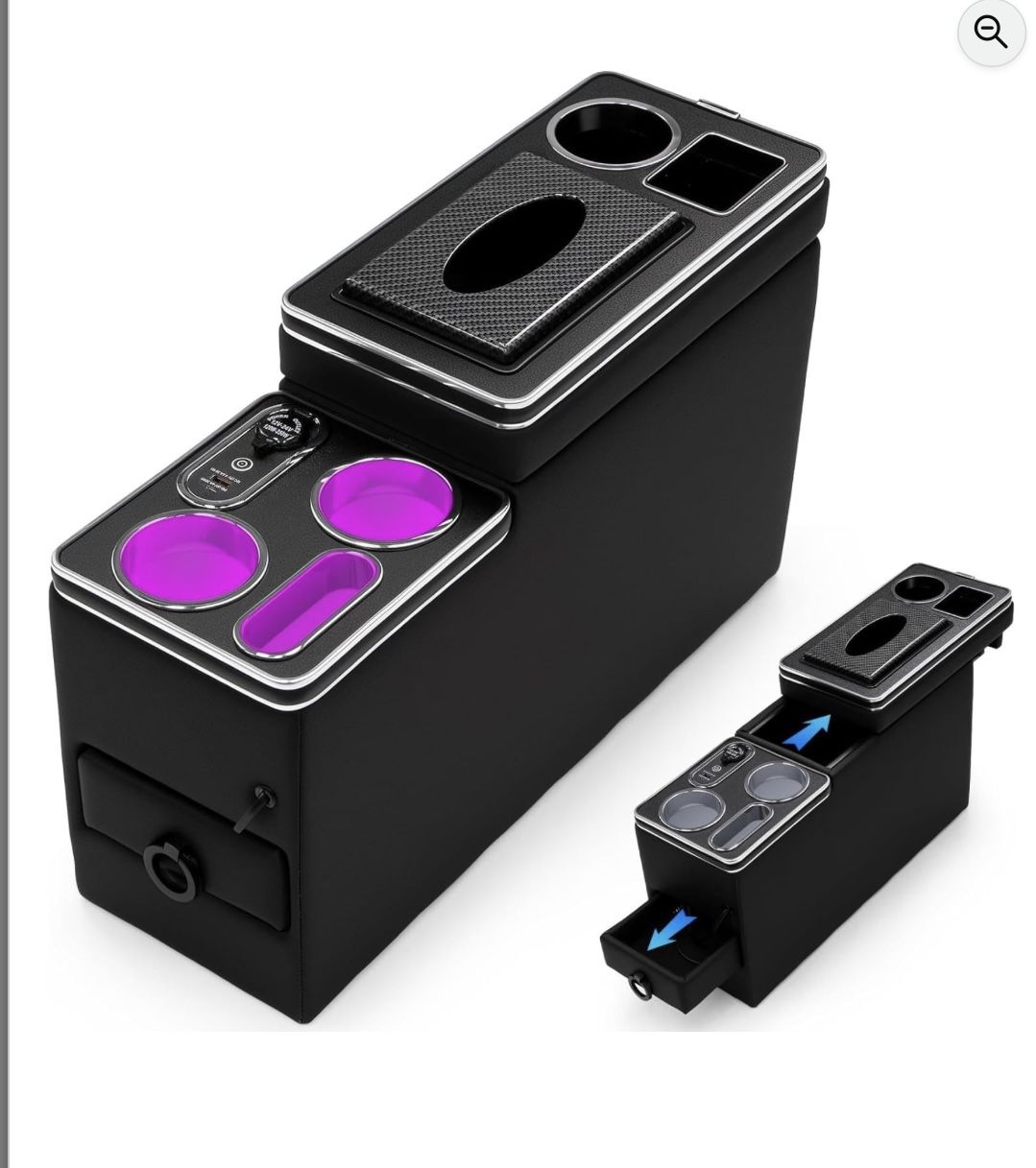 New in box! Cutler Bay pickup Center Console Between Seat Organizer for Minivans,SUVs,with Dual USB Charging ,Cup Holders,tissue box, 7 Color ambient lighting and drawers for Minivan, Middle Van Floor Console Organizer Storage Box Length 20.8 inches, Width 7 inches, Height 14 inches Transform the unused space between your seats into a command center! This versatile organizer features multiple compartments, deep drawers, and a large storage box to securely hold your phone, keys, sunglasses, tools, snacks, and more. Keep your cabin tidy and everything within easy reach. Stay powered up and set the mood! Equipped with dual USB ports (front and back), passengers in every row can charge their devices simultaneously. The added soft ambient lighting provides a modern, 7 Color ambient lighting luxurious glow and improves visibility at night without being distracting. Effortless, Tool-Free Installation Get organized in seconds! Simply place this console organizer securely between your front seats. No tools,