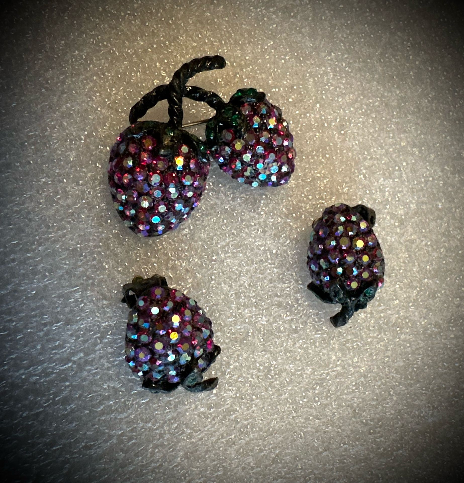 Rare Vintage WEISS Strawberry Clip On Earrings and brooch set. AB Red Rhinestones sparkly and sooo pretty 1950s Japanned. Excellent condition