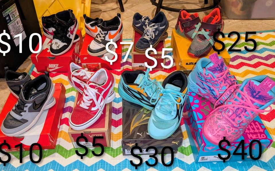 Puma Melo (blue/pink) size 4 Puma Melo (turquoise/black) size 3c Red Vans size 3 Nike Court Borough Low 2 (gray/black) size 2y Air Jordan (red/black/white) size 3y Nike Court Borough Low 2 (orange/black) size 2y Navy blue Vans size 2 LeBron Witness VII SE size 3y