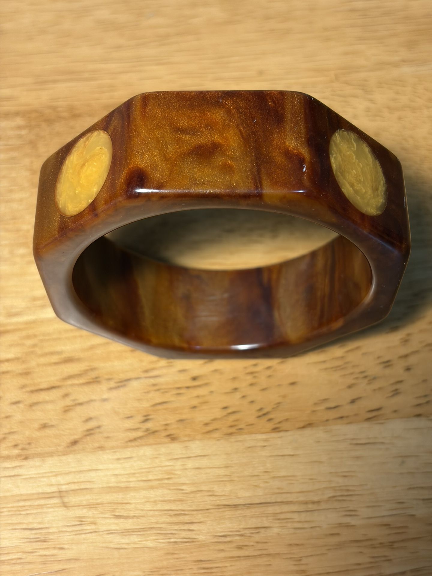 Sought after collectible octagon with warm colors of browns golds and yellows. There are four infused dots.