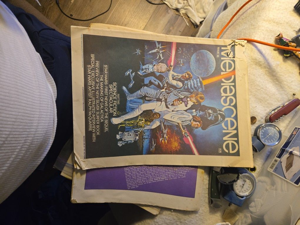 This is a vintage Mediascene magazine, Issue 30, from 1978. This specific issue is known for its extensive coverage of science fiction media at the time, featuring: A "Science Fiction Spectacular" that includes a feature on Star Wars: First News of the Sequel. An article on "The Making of Galactica". A preview of the new Silver Surfer book. An exclusive interview with Star Wars artist Ralph McQuarrie.