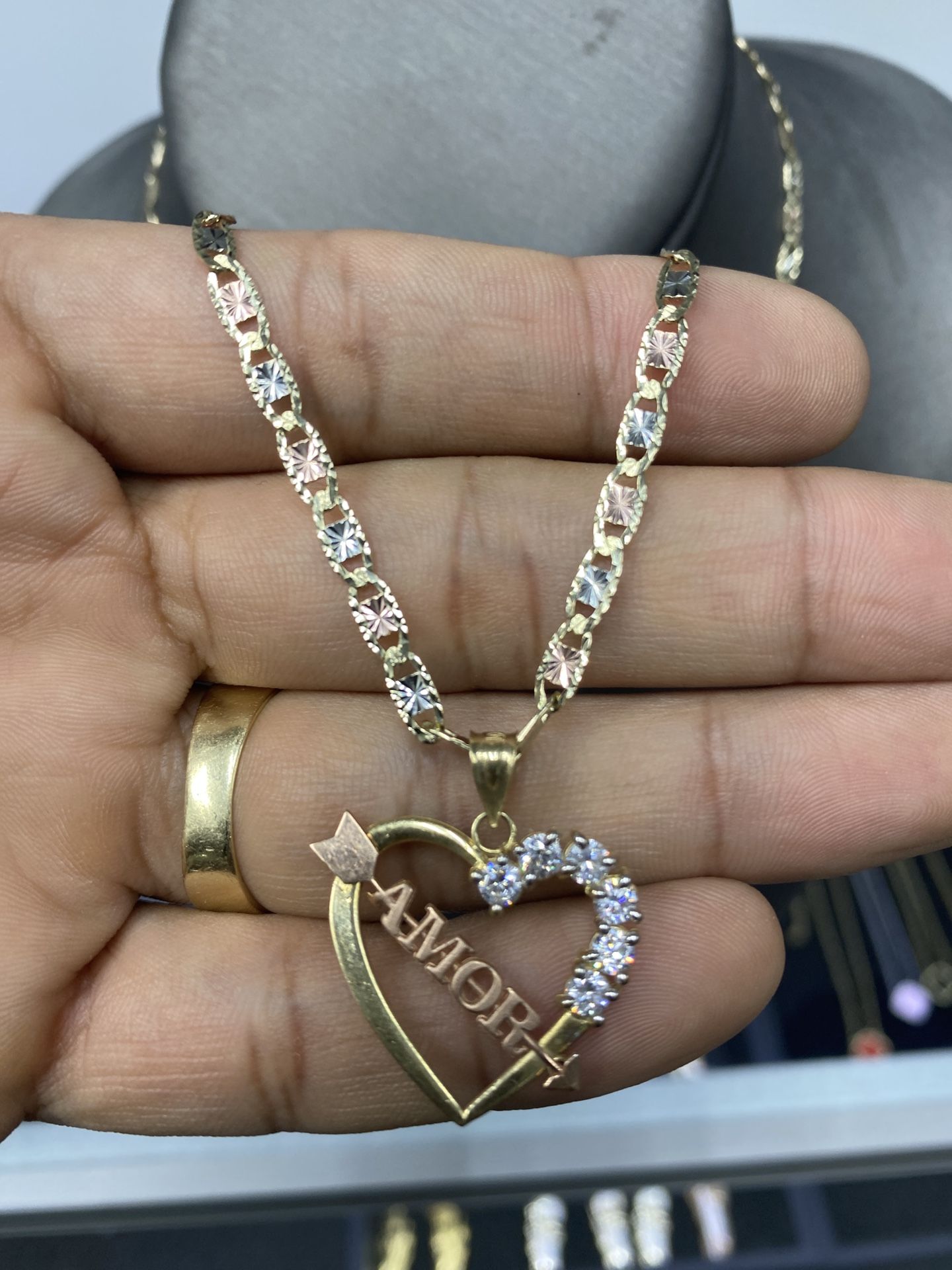 The chain is 3.5mm & 20” long with charm 1 1/2” Both are 10k gold 9g
