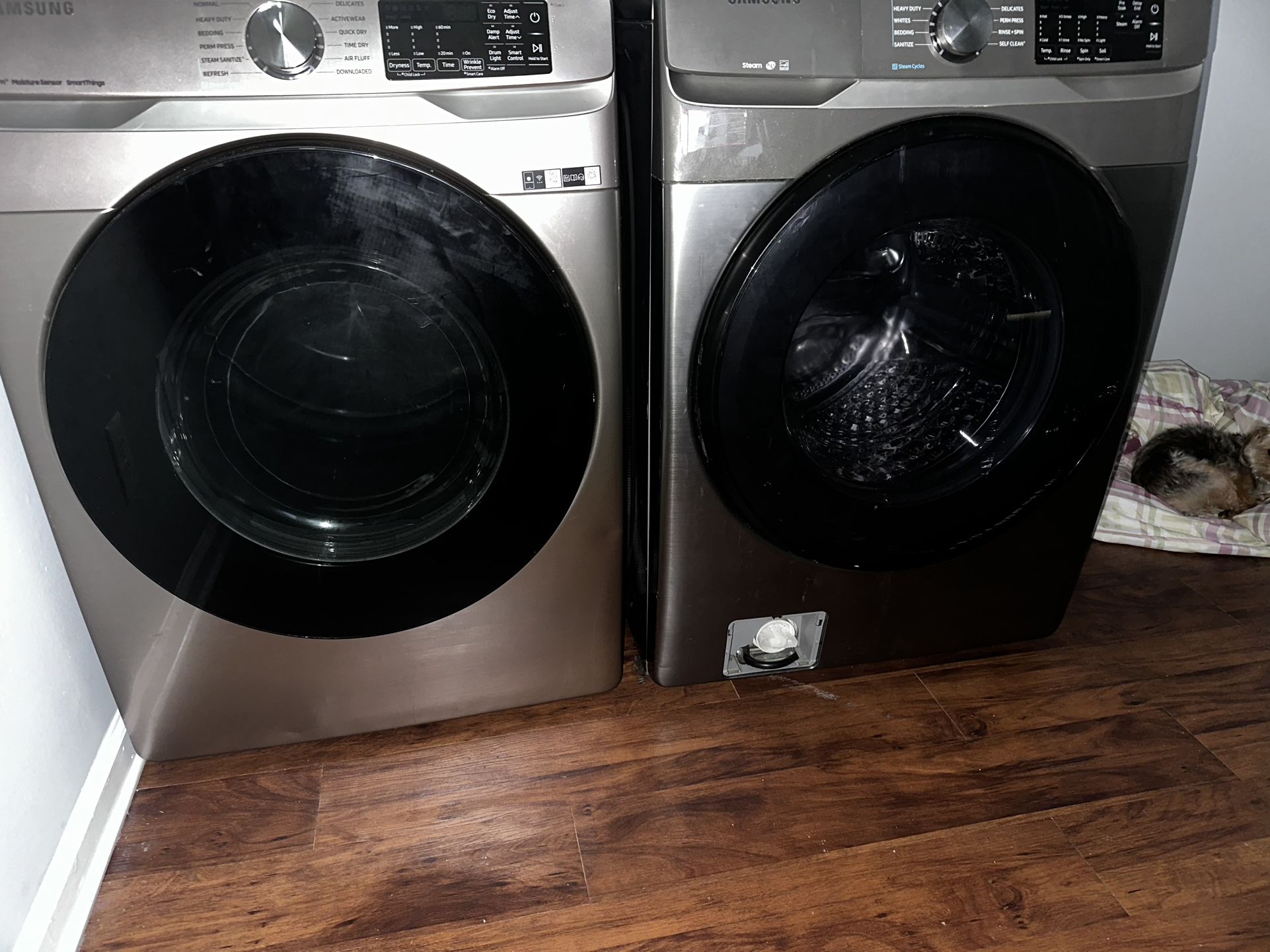 Used , Dryer is controllable from your smartphone through the samsung app /bluetooth. Dryer is champange color and washer is gray.