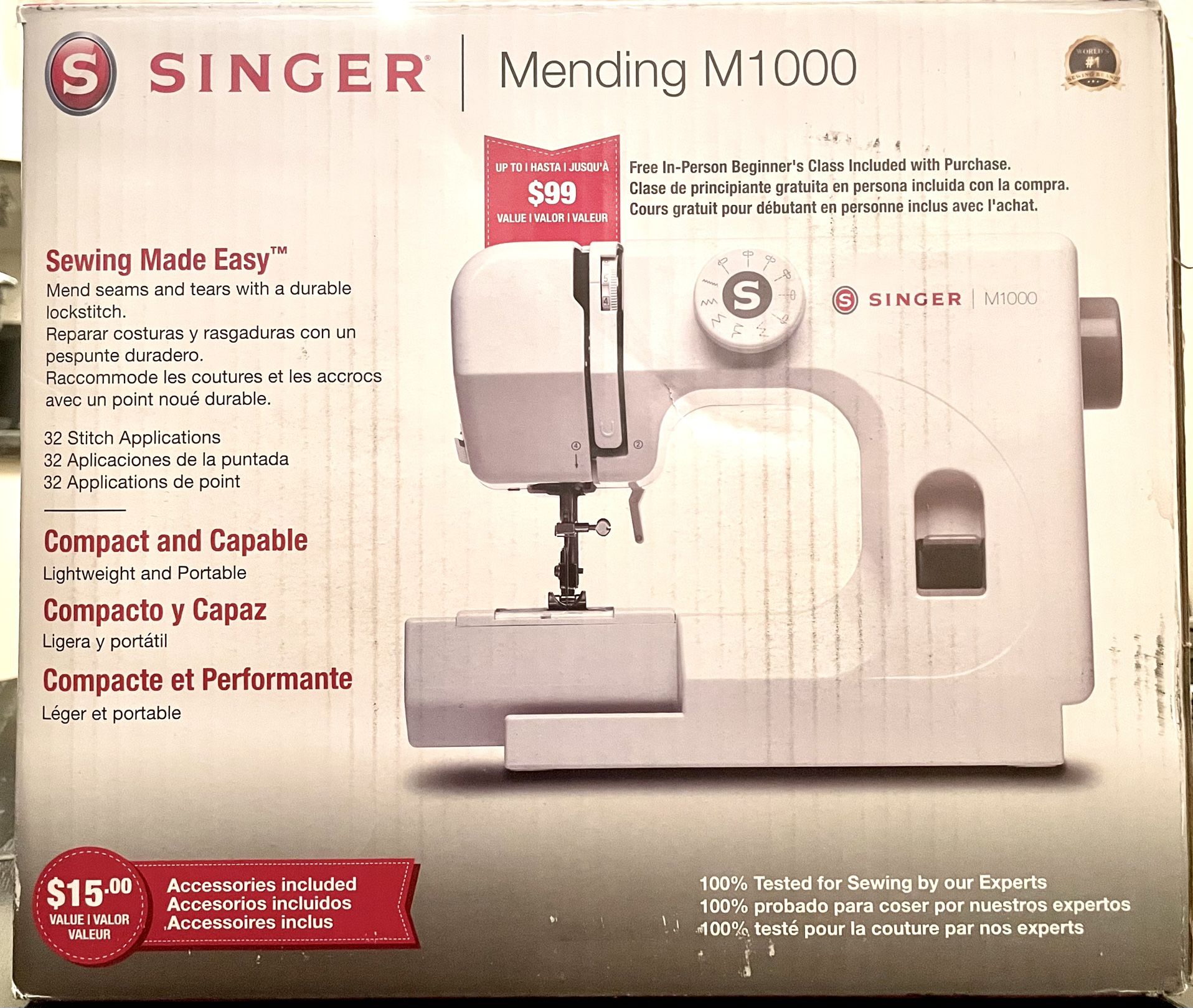 Singer M1000 Sewing Machine for sale. Item is New in Box. The box has been opened but never used. All parts and accessories are included. This is great machine for beginners or for someone who does not have a lot of room for a big sewing machine. Was purchased at Wal-Mart about 6 months ago for about $100