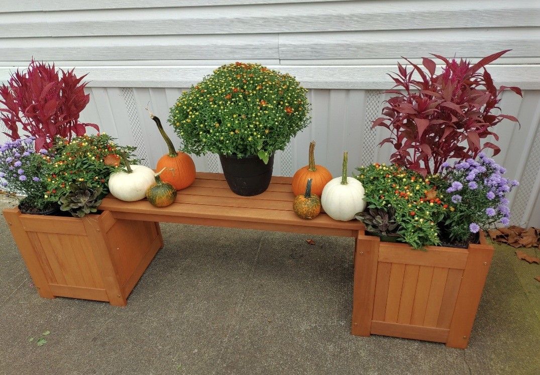 It needs sanding and stained. Teak wood. Very pretty when stained. Holds good sized plants and or bushes. Small ornamental trees.