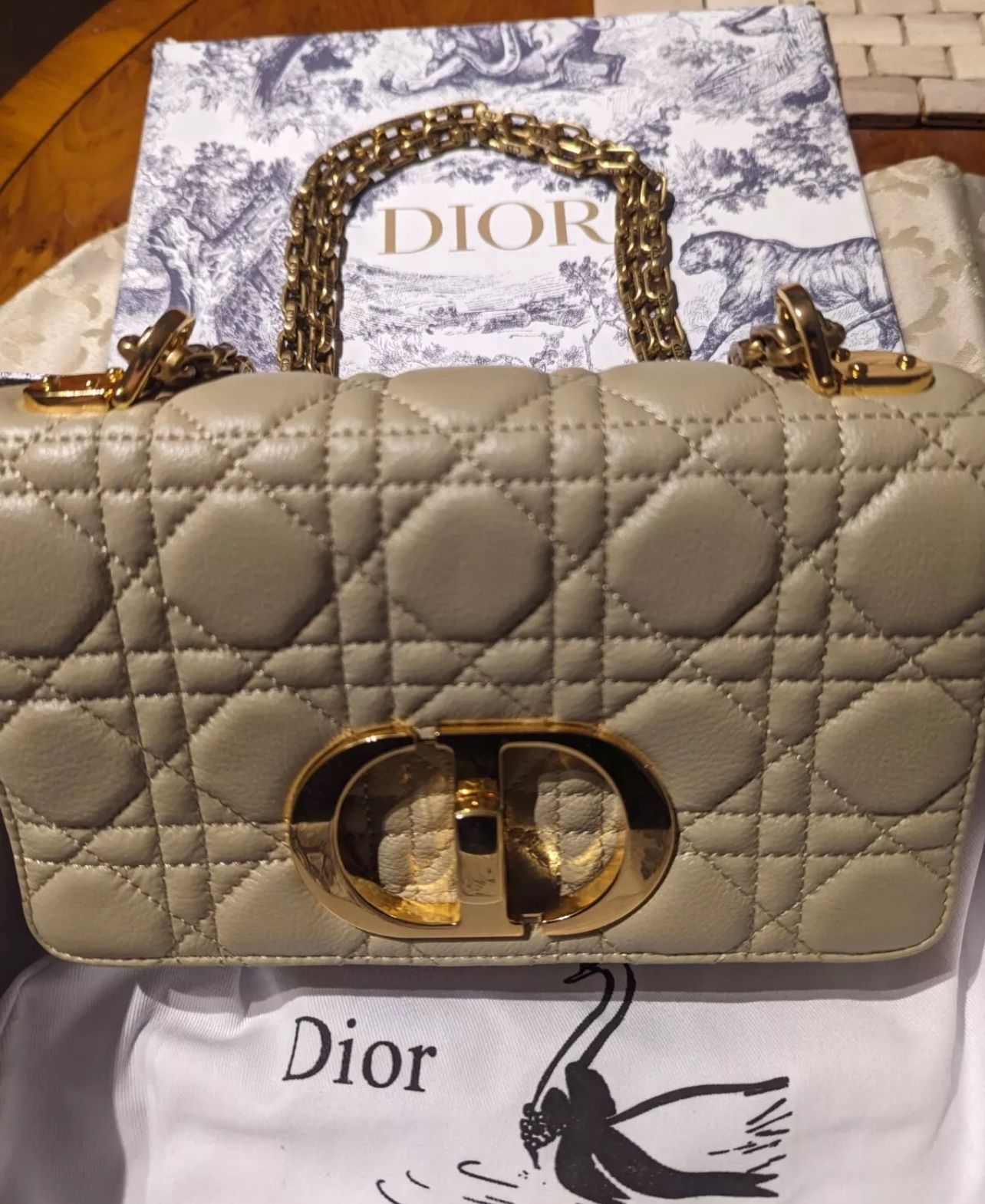 The Dior Caro bag combines modernity with timeless elegance. The style is crafted in rope beige supple calfskin with Cannage stitching. The bag showcases a flap adorned with an antique gold-finish metal CD twist clasp, inspired by the seal of a Christian Dior perfume bottle. The detachable chain strap with CD signature links allows the small bag to be carried by hand, worn over the shoulder or crossbody, and may be replaced by one of the House's wide embroidered straps for day or evening attire.