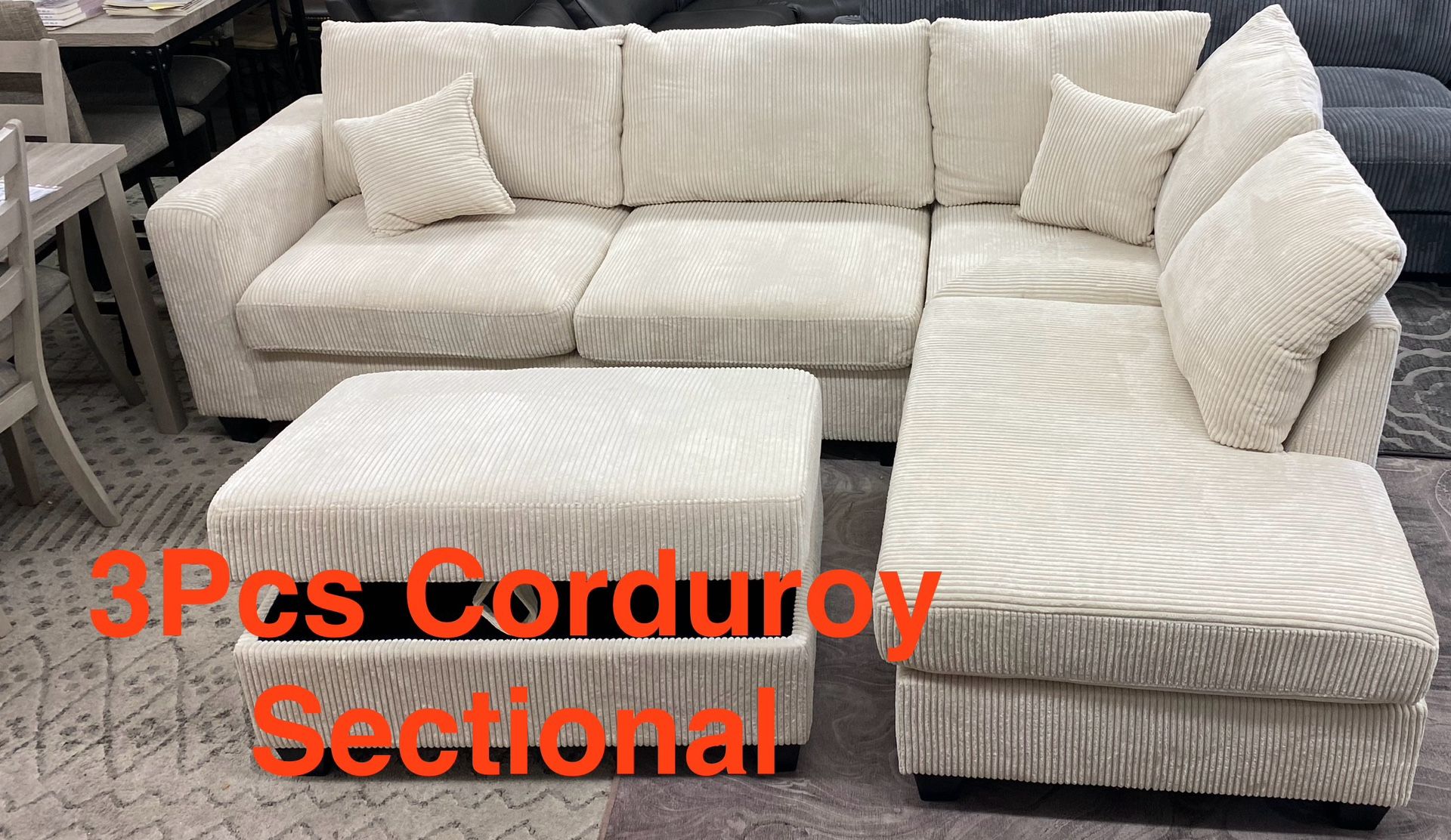 Brand New Beige Corduroy Fabric 3 Piece Sectional with Storage Ottoman, USB Port and Accent Pillows 106 x 76 x 35H AFFORDABLE PRICE GREAT QUALITY Free delivery Only $20 down! Financing available with Zero Interest on 90 Day payoff. (Easy to qualify) No Credit Needed! Can text you an application to your cell phone for immediate approval. WHEN YOU CHOOSE TO BUY FROM US; • Same/Next Day Delivery on most items. • Direct factory distributors - Pay for the item, not the overheads! • Cash / Venmo / Zelle / Cash App / Credit Card on delivery - Upfront Payment Optional.