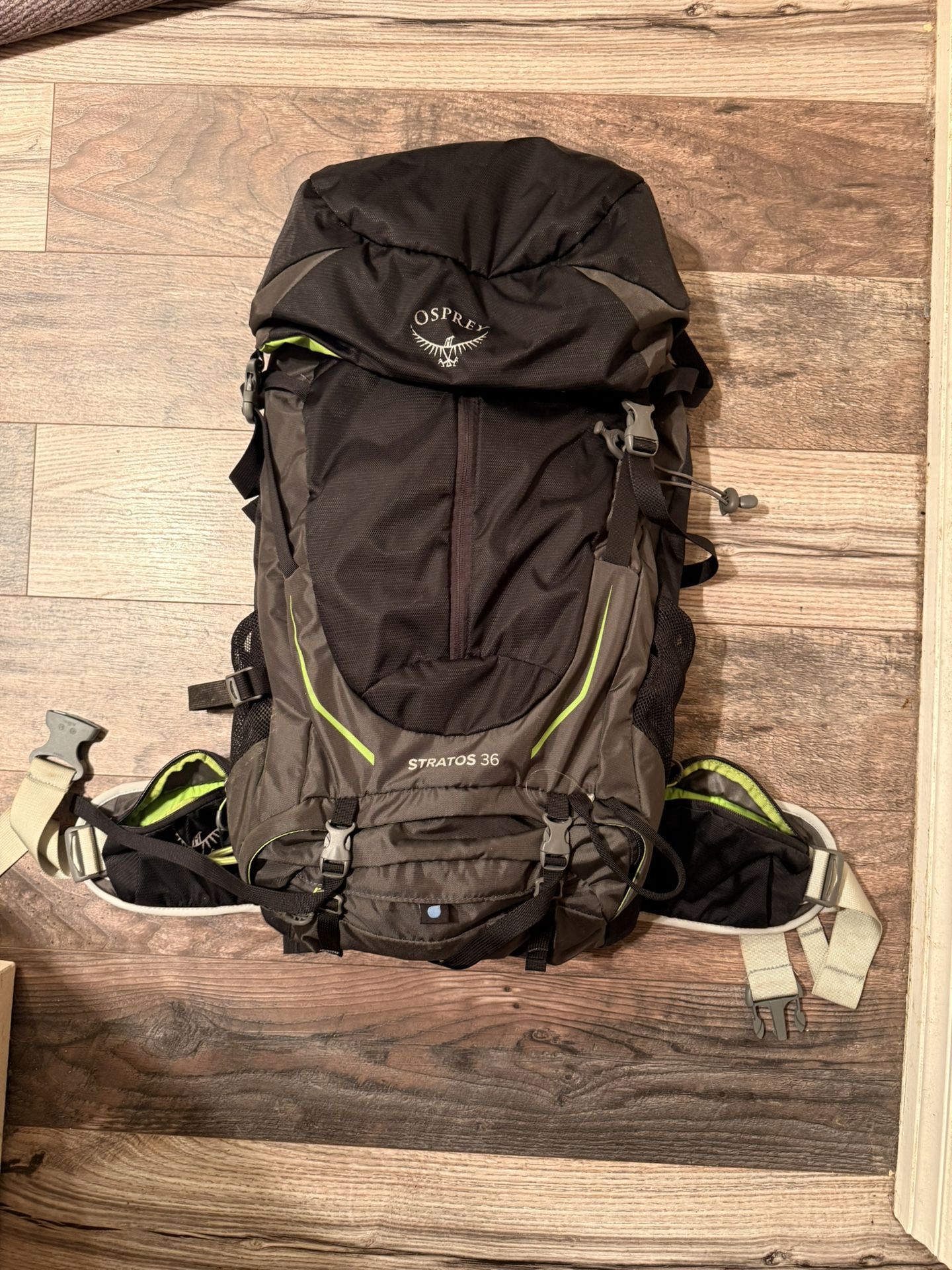 Osprey Stratos 36 hiking backpack. It has a 36-liter capacity, ideal for long day hikes and light overnight trips. The pack features an AirSpeed suspended mesh back panel for ventilation and comfort. It includes a built-in rain cover and a Stow-on-the-Go trekking pole attachment system. The design includes dual zippered hipbelt pockets and side stretch mesh bottle pockets for convenient storage. Like a New in perfect condition never used the water tank, bought it in the REI