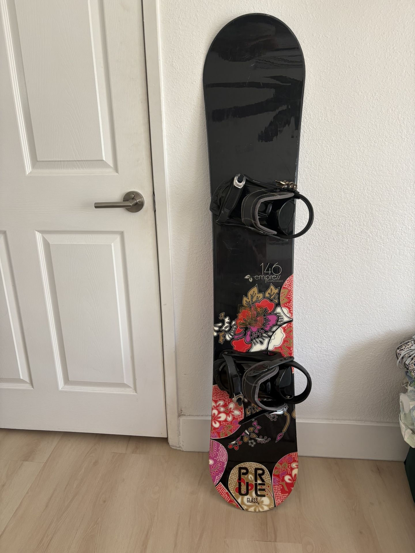 146” 5150 Empress snowboard. Used and in good condition. Has bindings that work great, but one buckle was replaced and doesn’t match (as shown).