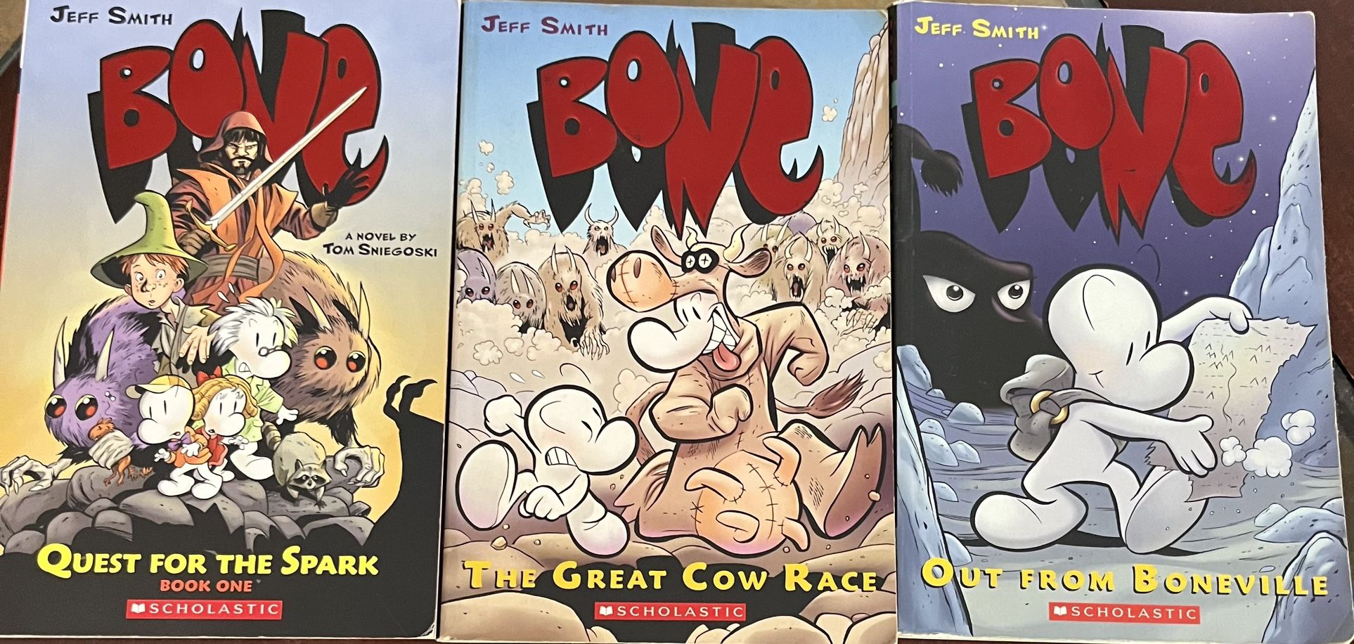 3 Books called Bones Comic series by Jeff Smith my child out grew the books. Mint condition books.